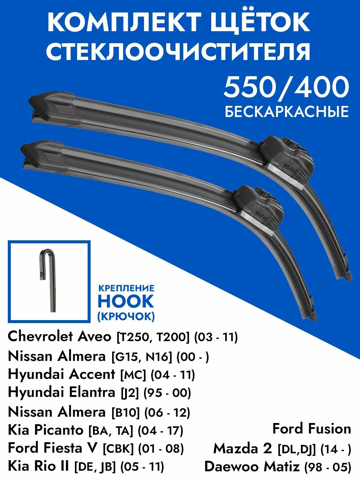 Щетки стеклоочистителя 550 400 Ford Fusion Chevrolet Aveo Т250 Hyundai Accent Kia Rio 2 Picanto / Комплект дворники 2 шт Фьюжн Авео Акцент Рио Пиканто информация: