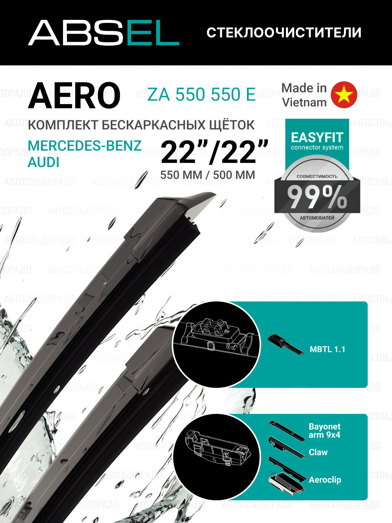 ABSEL Щётки стеклоочистителя бескаркасные ZA550550E 550мм/550мм, комплект для MERCEDES-BENZ GLC 2015-2023, C-CLASS 2013-2023, EQC 2019-2023, B-CLASS 2014-2018; информация: