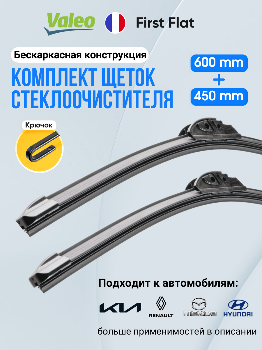 Отзывы на Комплект бескаркасных щеток стеклоочистителя 600 / 450 мм Valeo First Flat. Крепление крючок 9x3 / 9x4