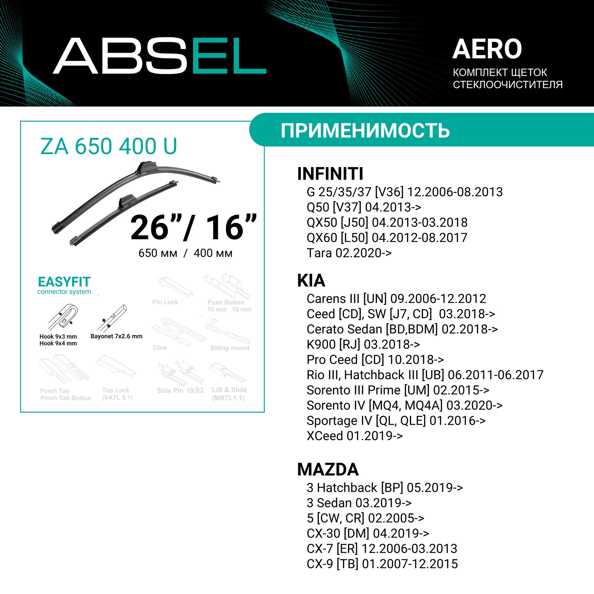 ABSEL Щетки стеклоочистителя бескаркасные 650мм/400мм, комплект ZA650400U для HYUNDAI SOLARIS IV 2010-2017, CRETA 2016-2021; KIA RIO III 2011-2017 информация: