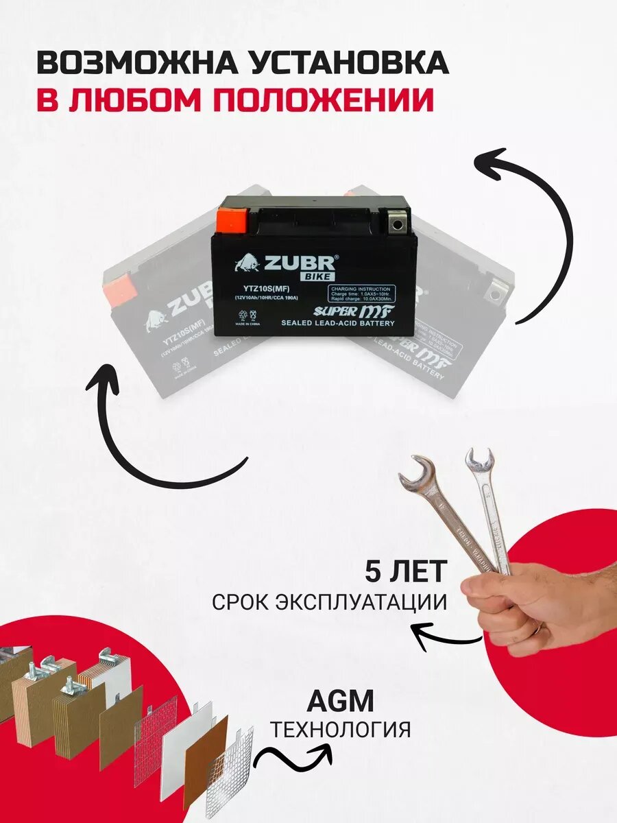Отзывы на Аккумулятор для 12v ZUBR YTZ10S(MF) прямая полярность 10 Ah 190 A AGM, акб на скутер, мопед, квадроцикл 150x87x94 мм