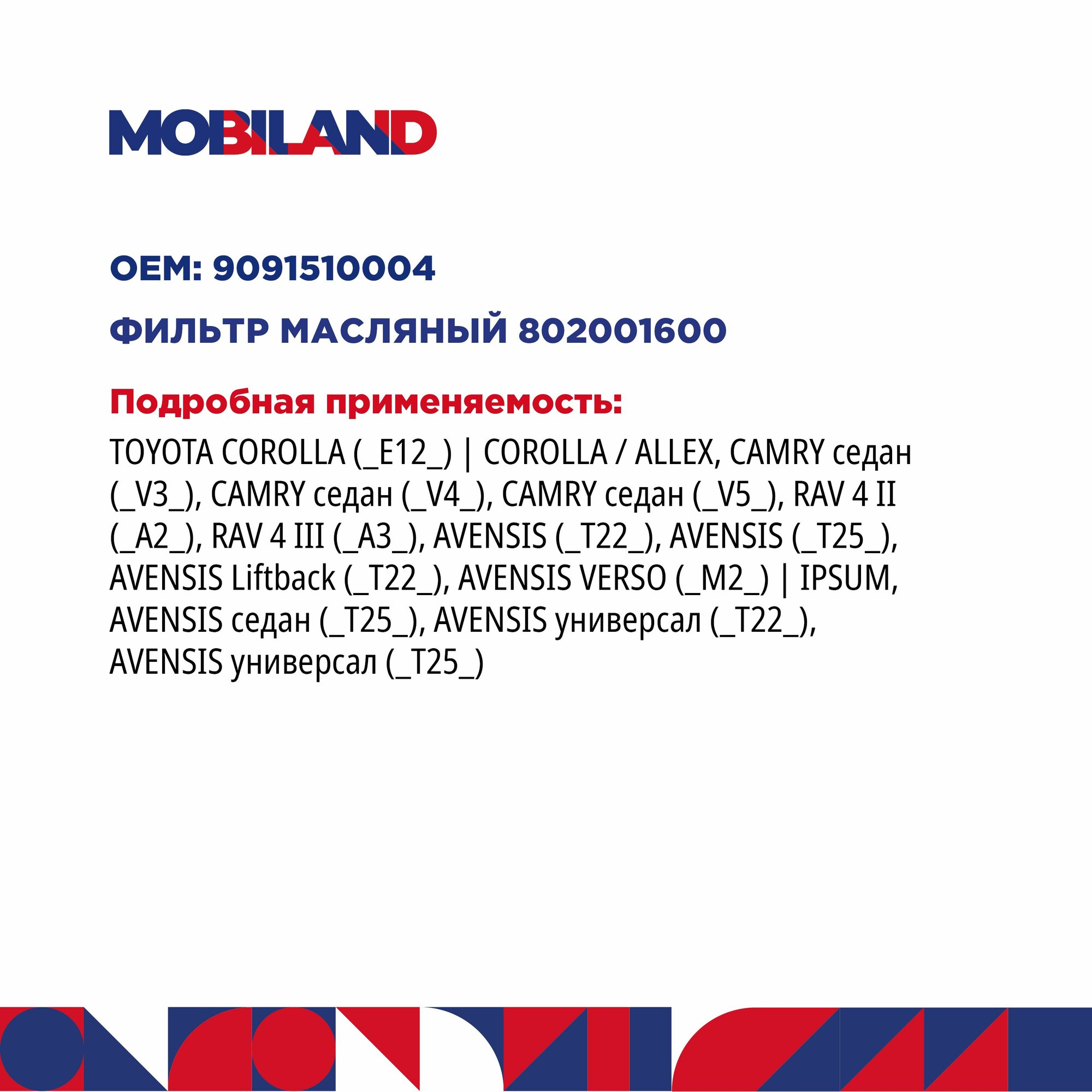 Отзывы на Фильтр масляный для а/м TOYOTA COROLLA CAMRY седан, CAMRY седан, RAV 4 III, AVENSIS седан, MOBILAND 802001600