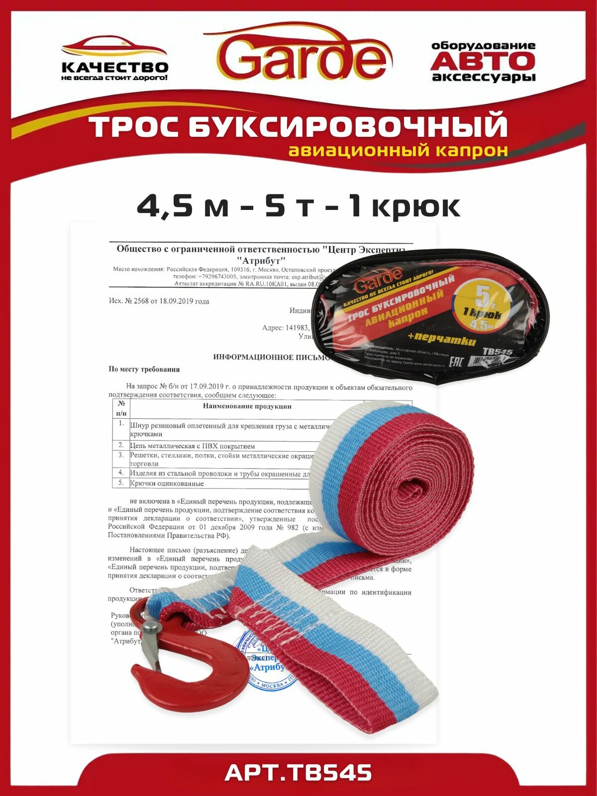 Трос буксировочный 5т Garde 1-н крюк 4,5 м авиационный капрон в сумке + перчатки информация: