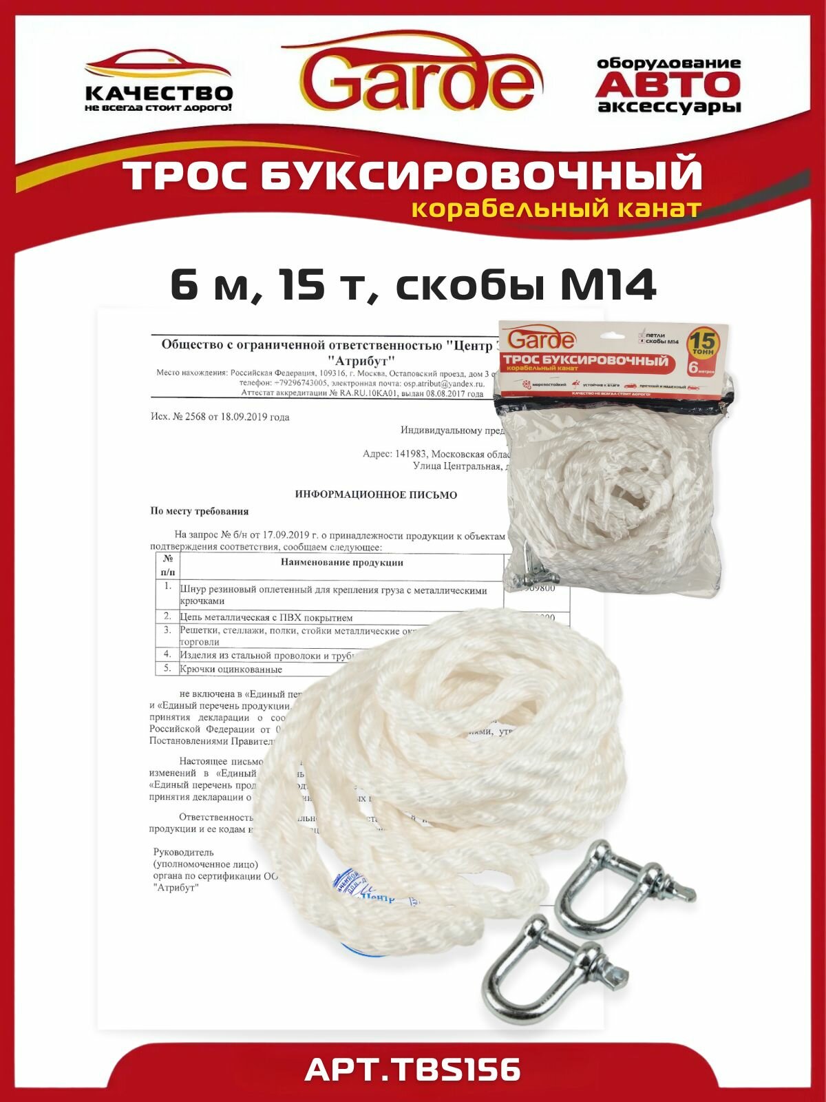 Трос буксировочный 15т скобы М14 6 м Garde корабельный канат в сумке информация: