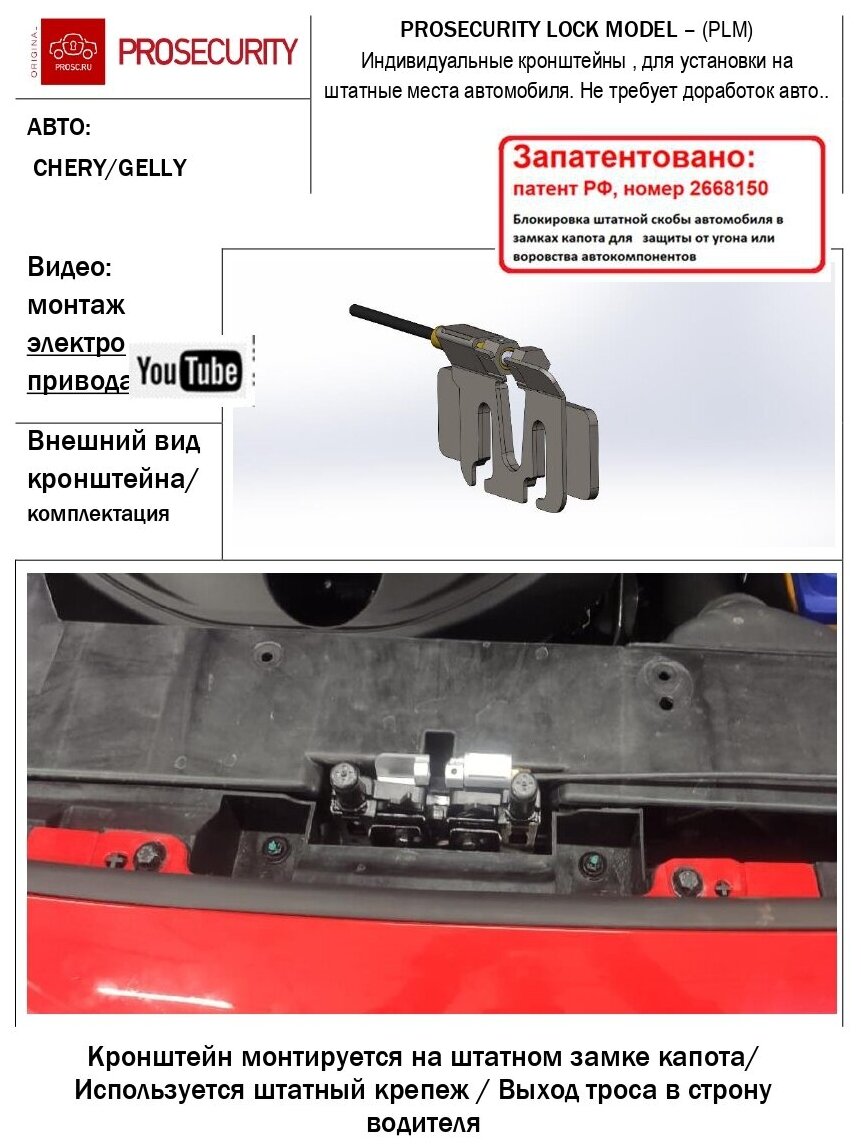 Механический замок капота для Belgee X70, Geely Atlas Pro, Exeed LX PROSECURITY информация: