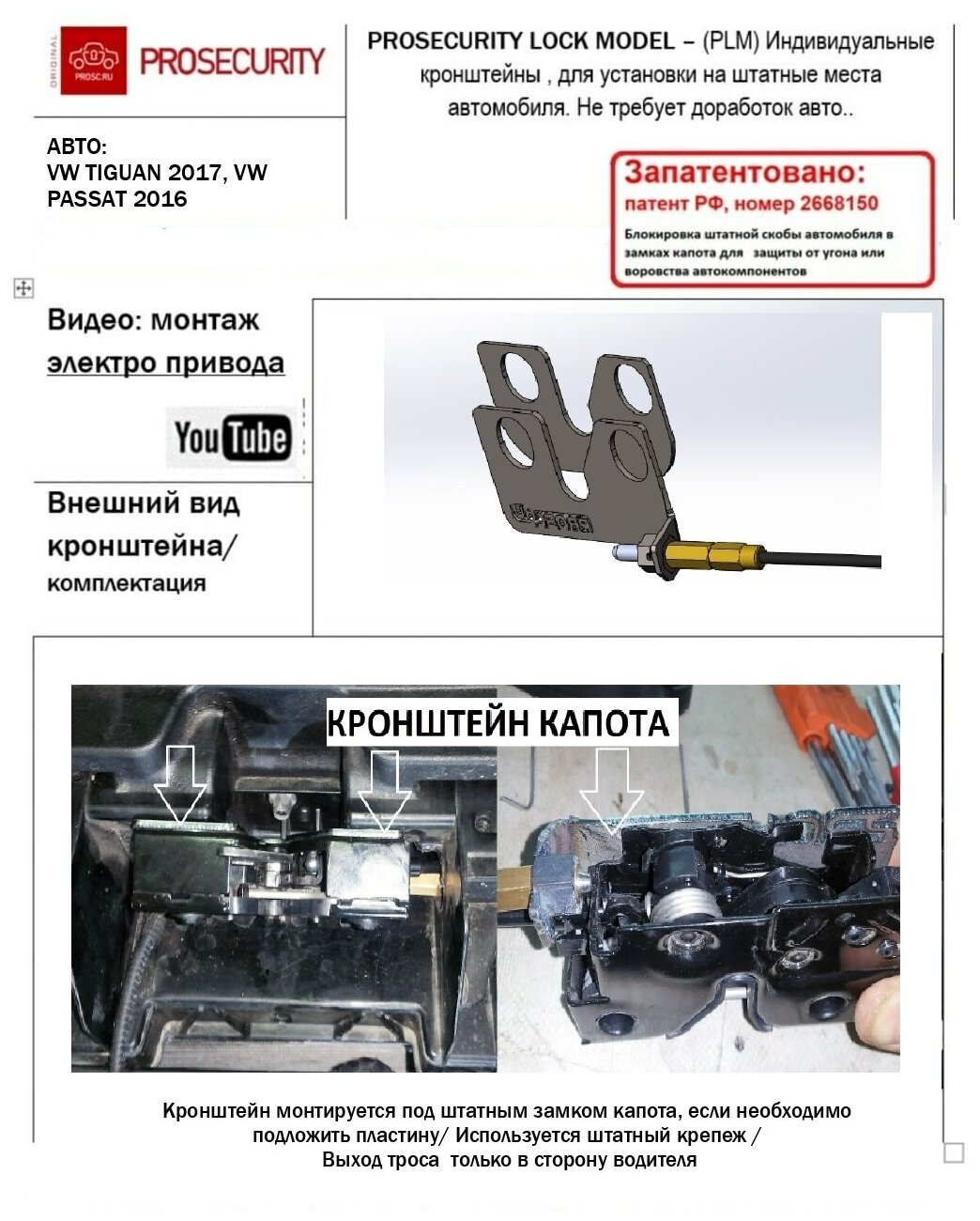 Механический замок капота для Volkswagen Passat B8, Tiguan(2017-) PROSECURITY информация:
