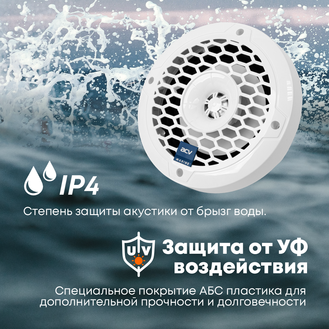Морская акустика ACV M6W 140 Вт, 6,5', комплект динамиков 2 шт, влагостойкие колонки для лодки, катера, яхты водонепроницаемые 2-полосные, цв. белый информация:
