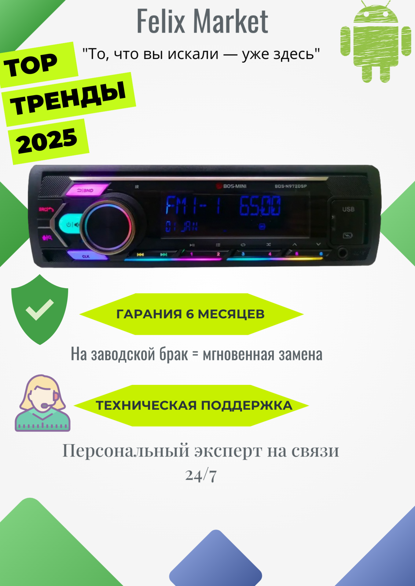 Автомагнитола 1 DIN DSP Процессорная магнитола BOS-MINI, RDS, Bluetooth, AUX, громкая связь, USB и Type-C , RGB информация: