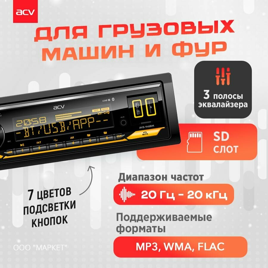 Магнитола-USB ACV AVS-948BM для авто, 24V, Bluetooth, 1DIN, 4х45 Вт информация: