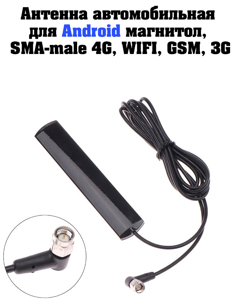 10 цен на Антенна автомобильная для Android (андроид) магнитол, кабель 1.5м, SMA-male 4G, WIFI, GSM, 3G угловой разъем