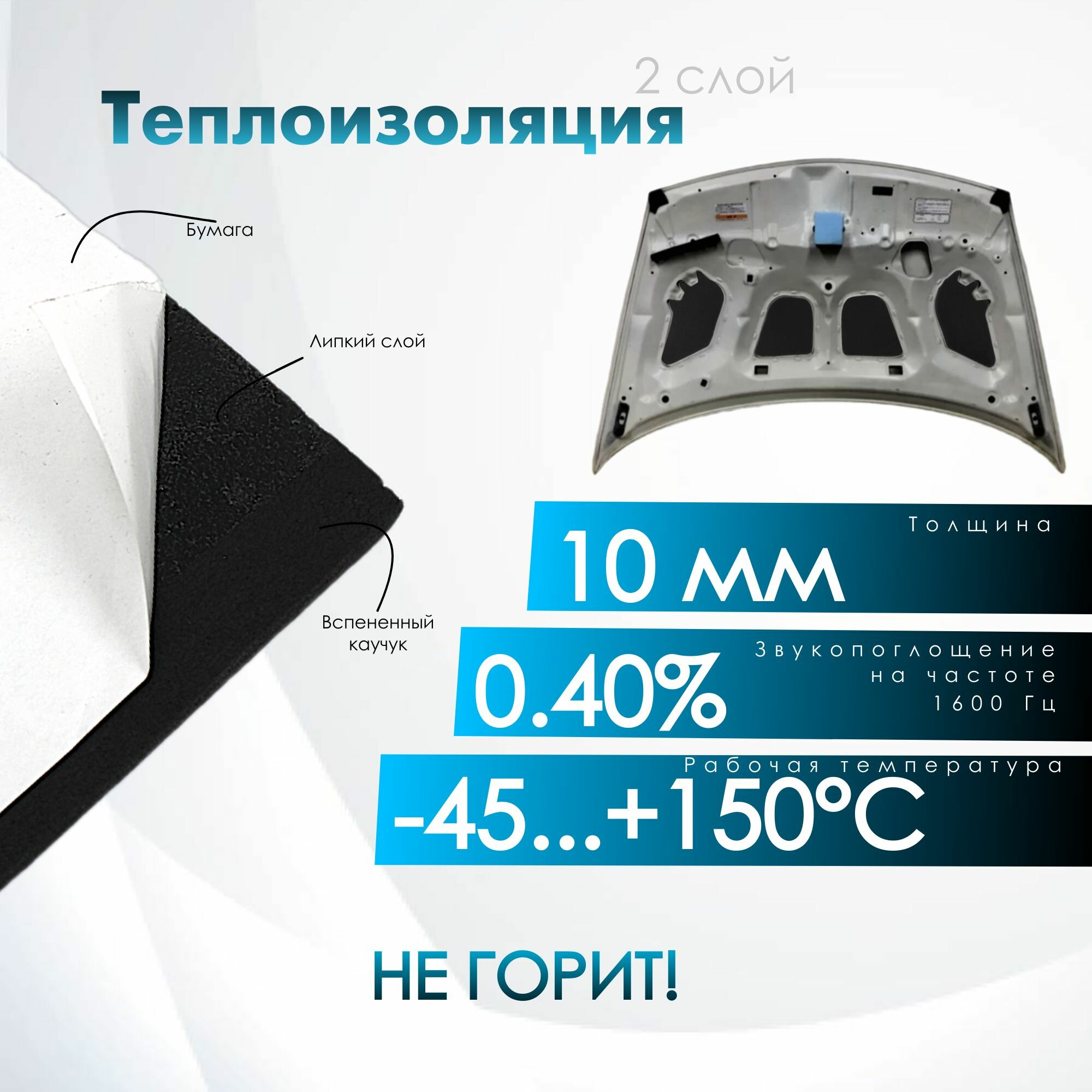 Комплект шумо и теплоизоляции капота Mitsubishi Lancer X бутилкаучуковая основа с фольгой 2 мм вспененный каучук 10 мм 3 650 ₽