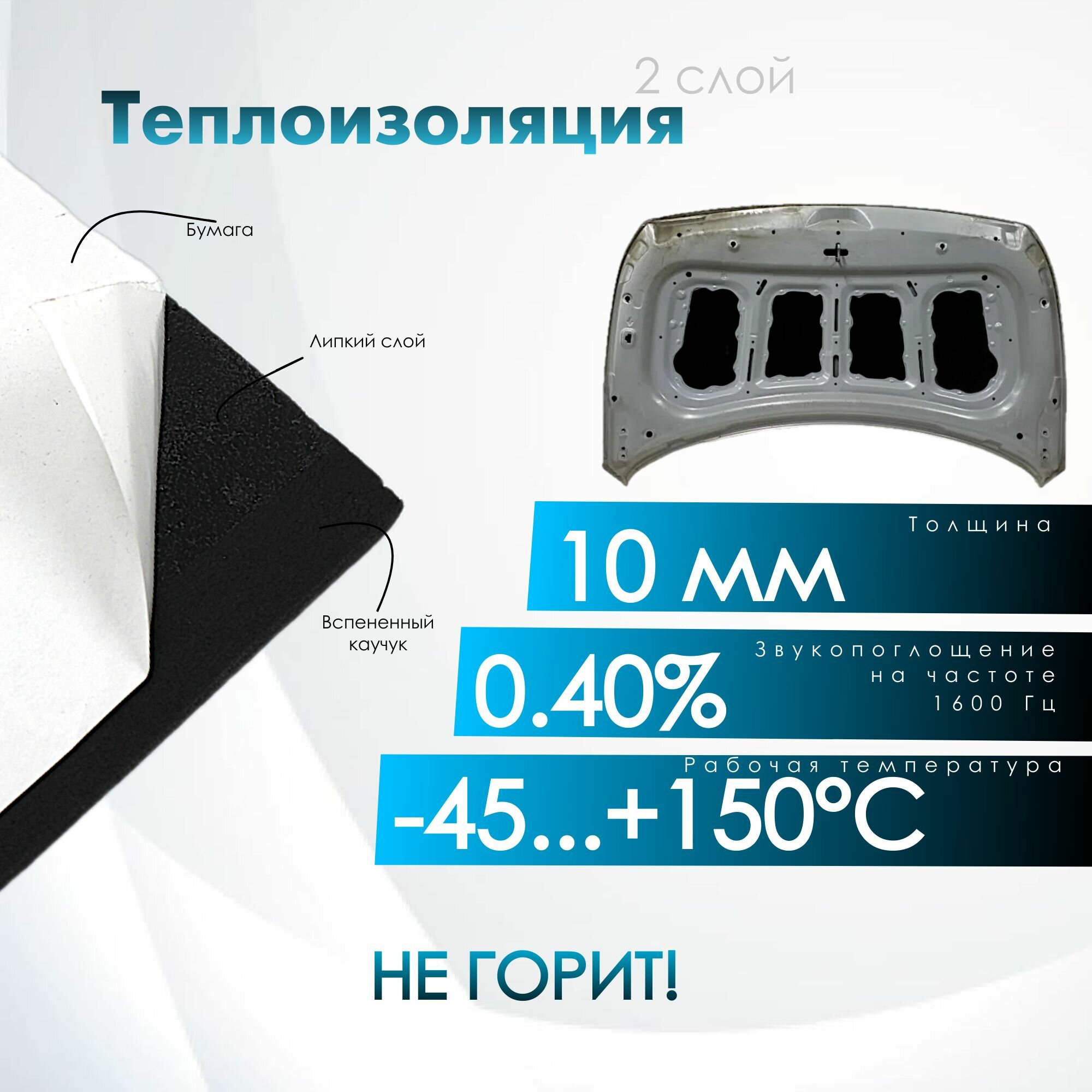 Комплект шумо и теплоизоляции капота ВАЗ 2114 2115 2113 бутилкаучуковая основа с фольгой 2 мм вспененный каучук 10 мм 3 650 ₽