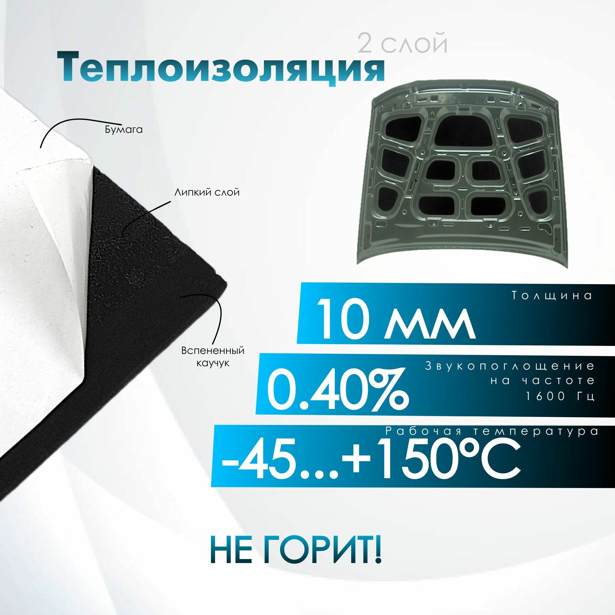 Комплект шумо и теплоизоляции капота Chery Tiggo 7 Pro Max T1E Лада X-cross 5 бутилкаучуковая основа с фольгой 2 мм вспененный каучук 10 мм 3 950 ₽