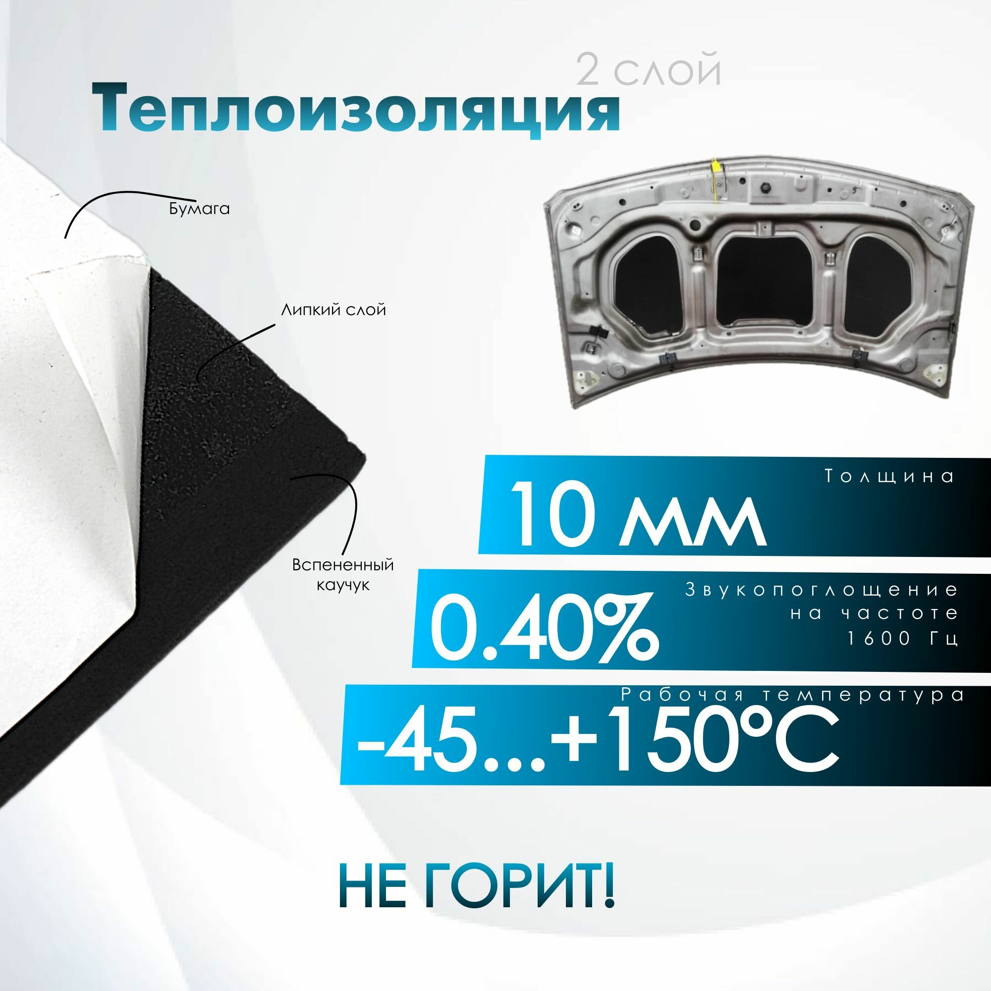 Комплект шумо и теплоизоляции капота Mitsubishi Lancer X бутилкаучуковая основа с фольгой 2 мм вспененный каучук 10 мм 3 650 ₽