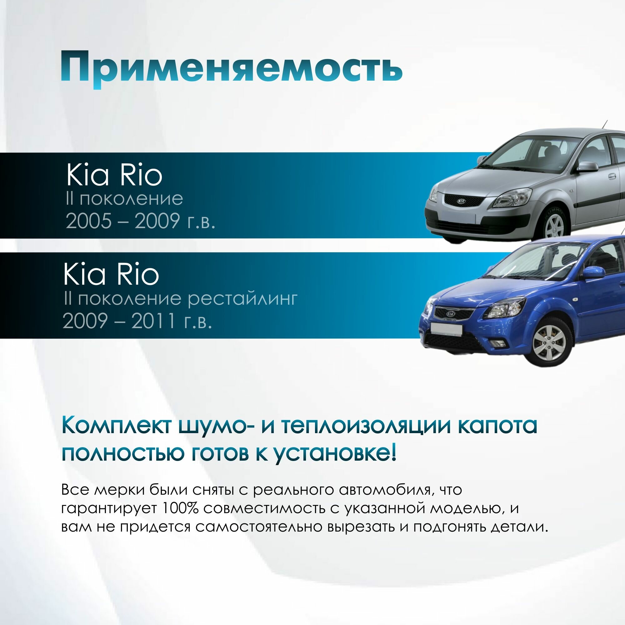 Комплект шумо и теплоизоляции капота Kia Rio 2 2005-2011 бутилкаучуковая основа с фольгой 2 мм вспененный каучук 10 мм информация: