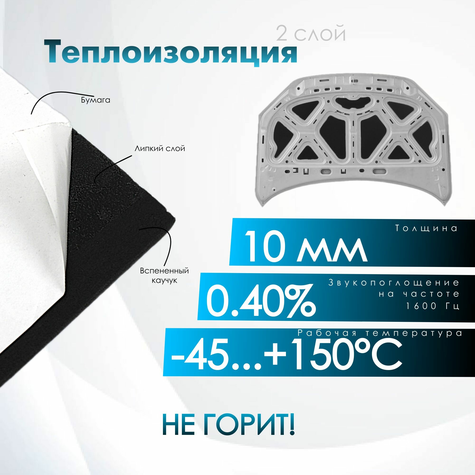 Комплект шумо и теплоизоляции капота Chery Tiggo 7 Pro Max T1E Лада X-cross 5 бутилкаучуковая основа с фольгой 2 мм вспененный каучук 10 мм 3 950 ₽