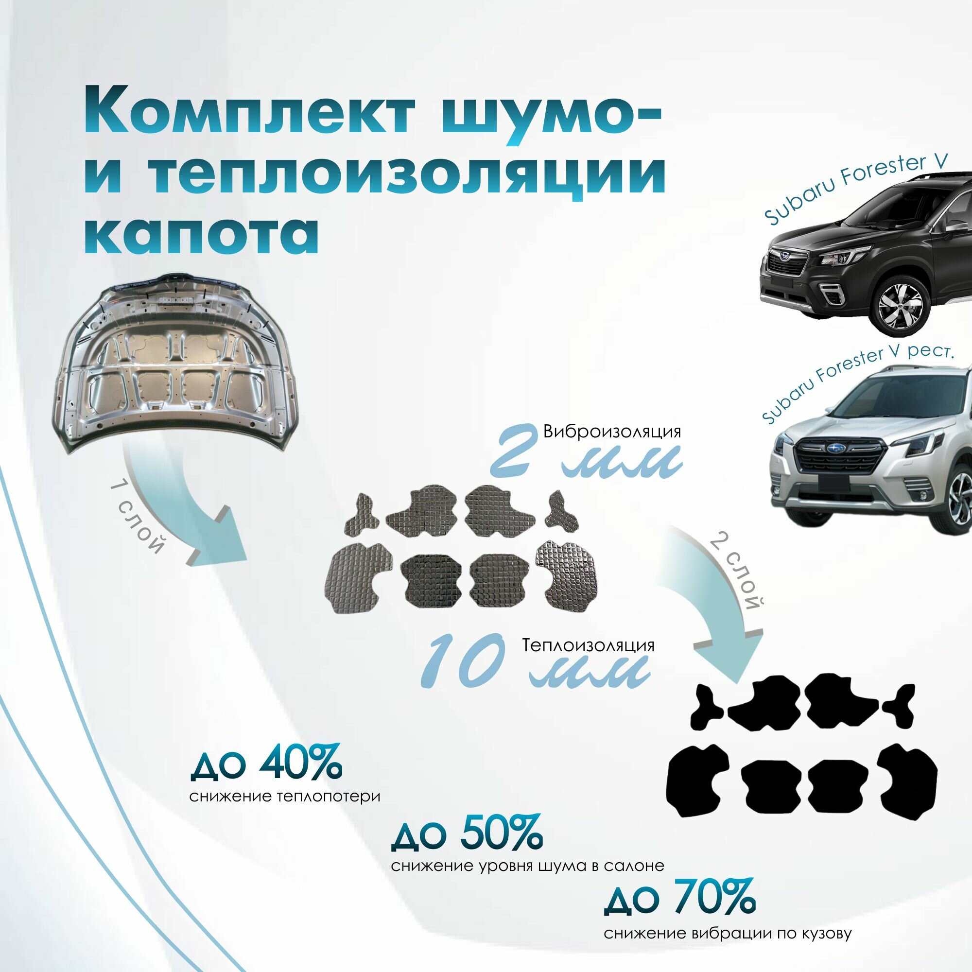 Комплект шумо и теплоизоляции капота Subaru Forester 5 бутилкаучуковая основа с фольгой 2 мм вспененный каучук 10 мм информация:
