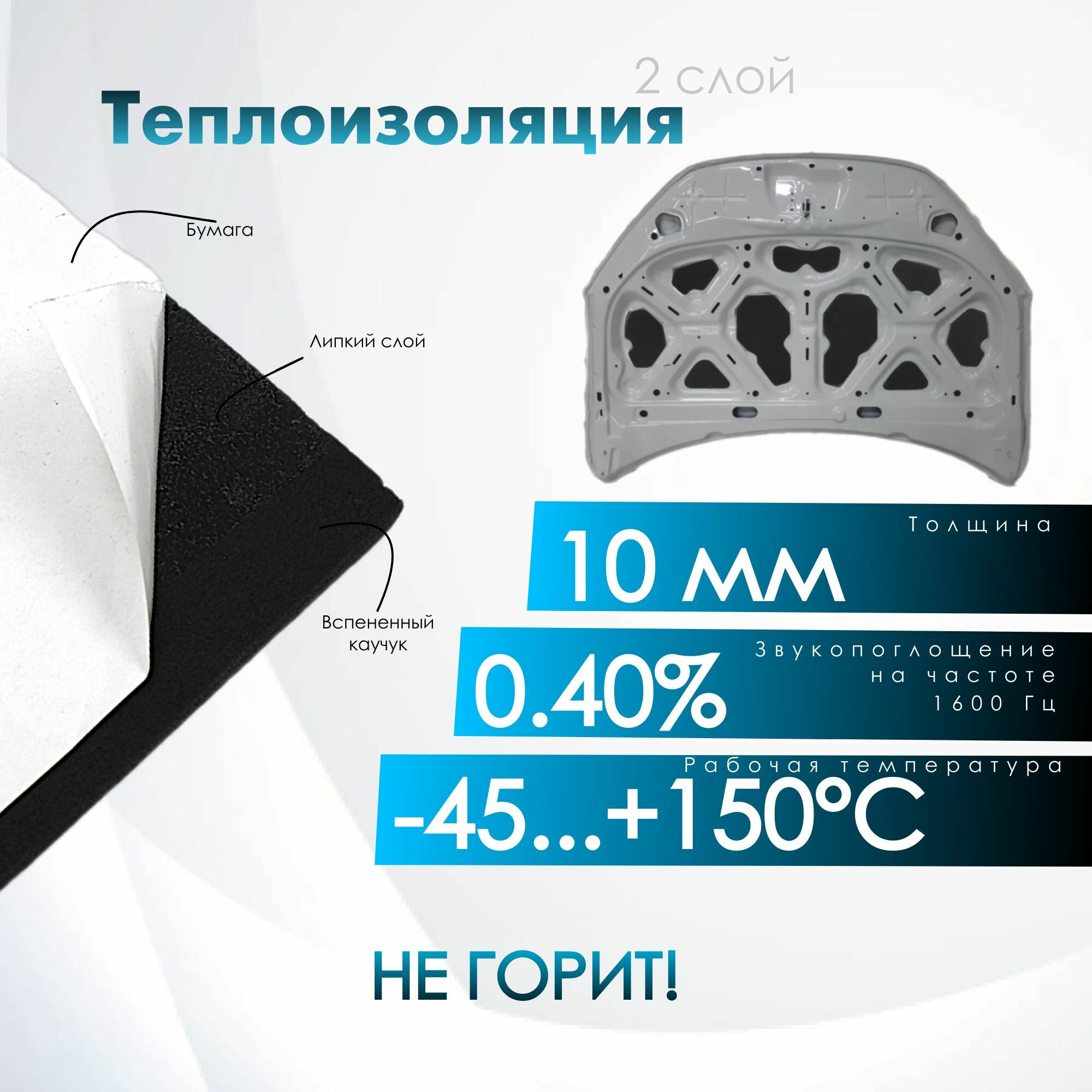 Комплект шумо и теплоизоляции капота Hyundai Tucson 1 бутилкаучуковая основа с фольгой 2 мм вспененный каучук 10 мм 3 650 ₽