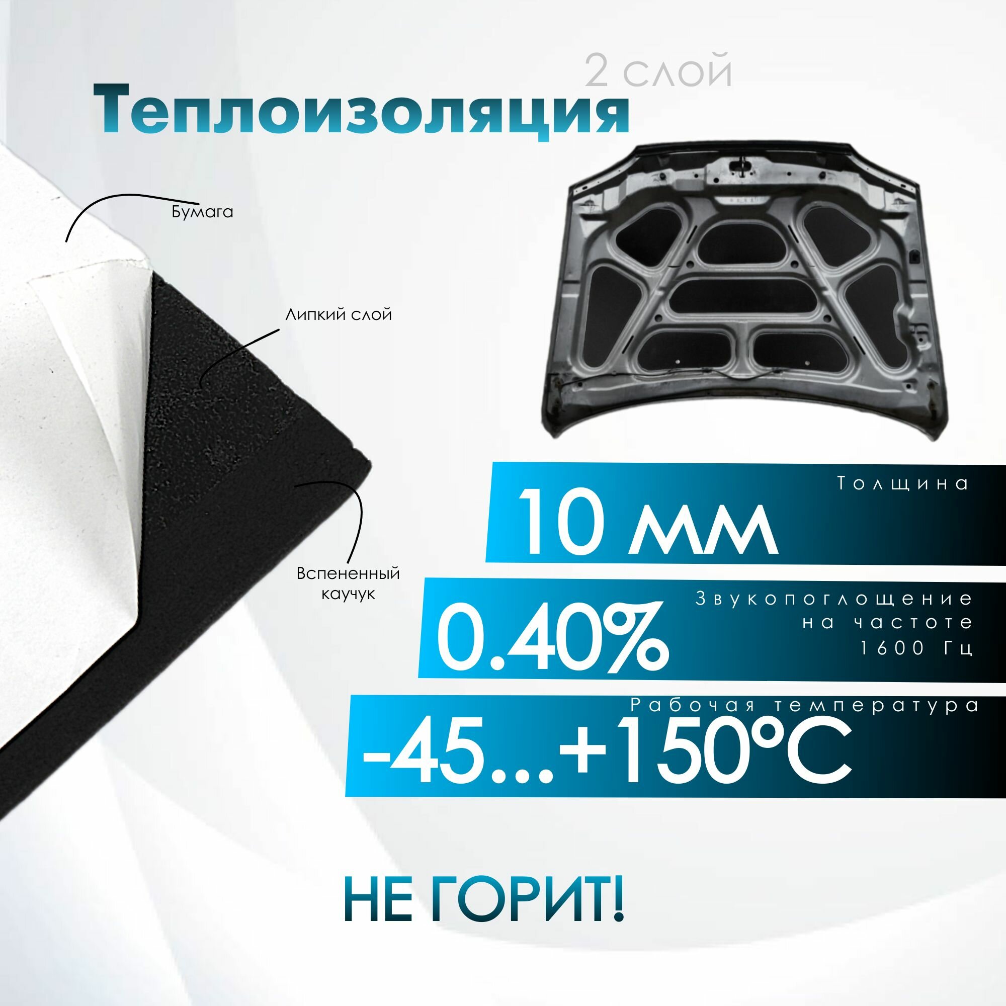 Комплект шумо и теплоизоляции капота ВАЗ 2114 2115 2113 бутилкаучуковая основа с фольгой 2 мм вспененный каучук 10 мм 3 650 ₽