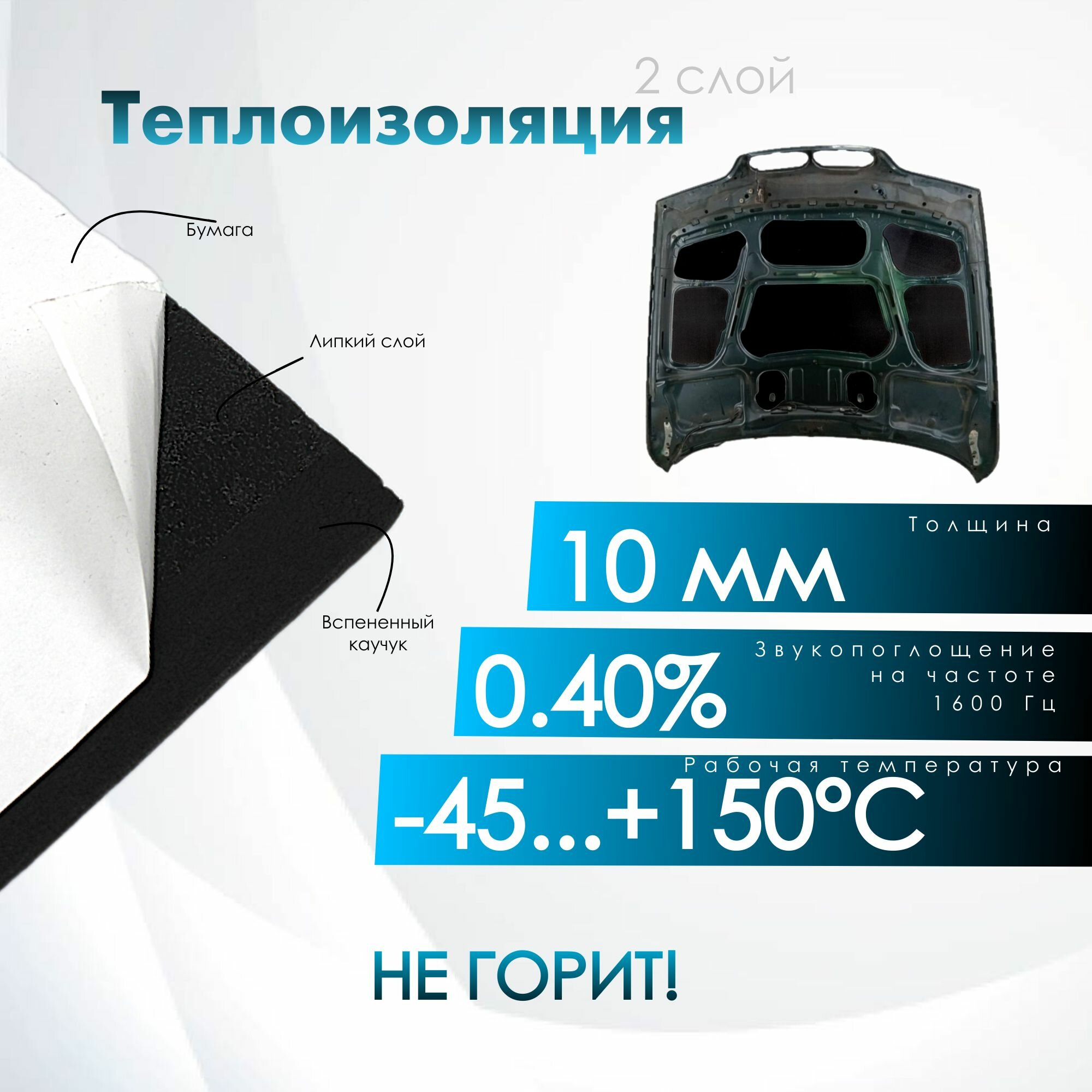 Комплект шумо и теплоизоляции капота ВАЗ 2114 2115 2113 бутилкаучуковая основа с фольгой 2 мм вспененный каучук 10 мм 3 650 ₽