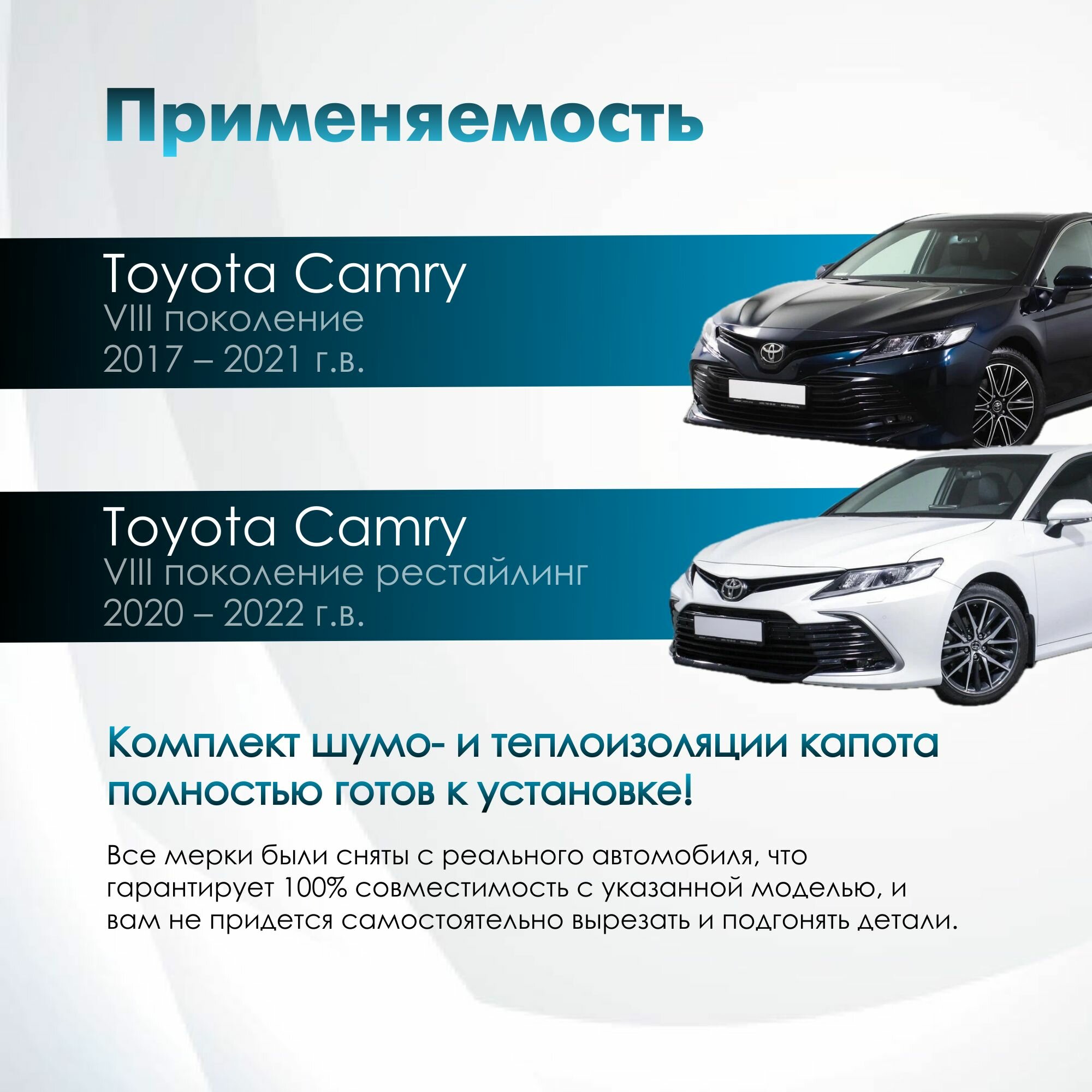 Комплект шумо и теплоизоляции капота Toyota Camry VIII (XV70) 2017-2022 бутилкаучуковая основа с фольгой 2 мм вспененный каучук 10 мм информация: