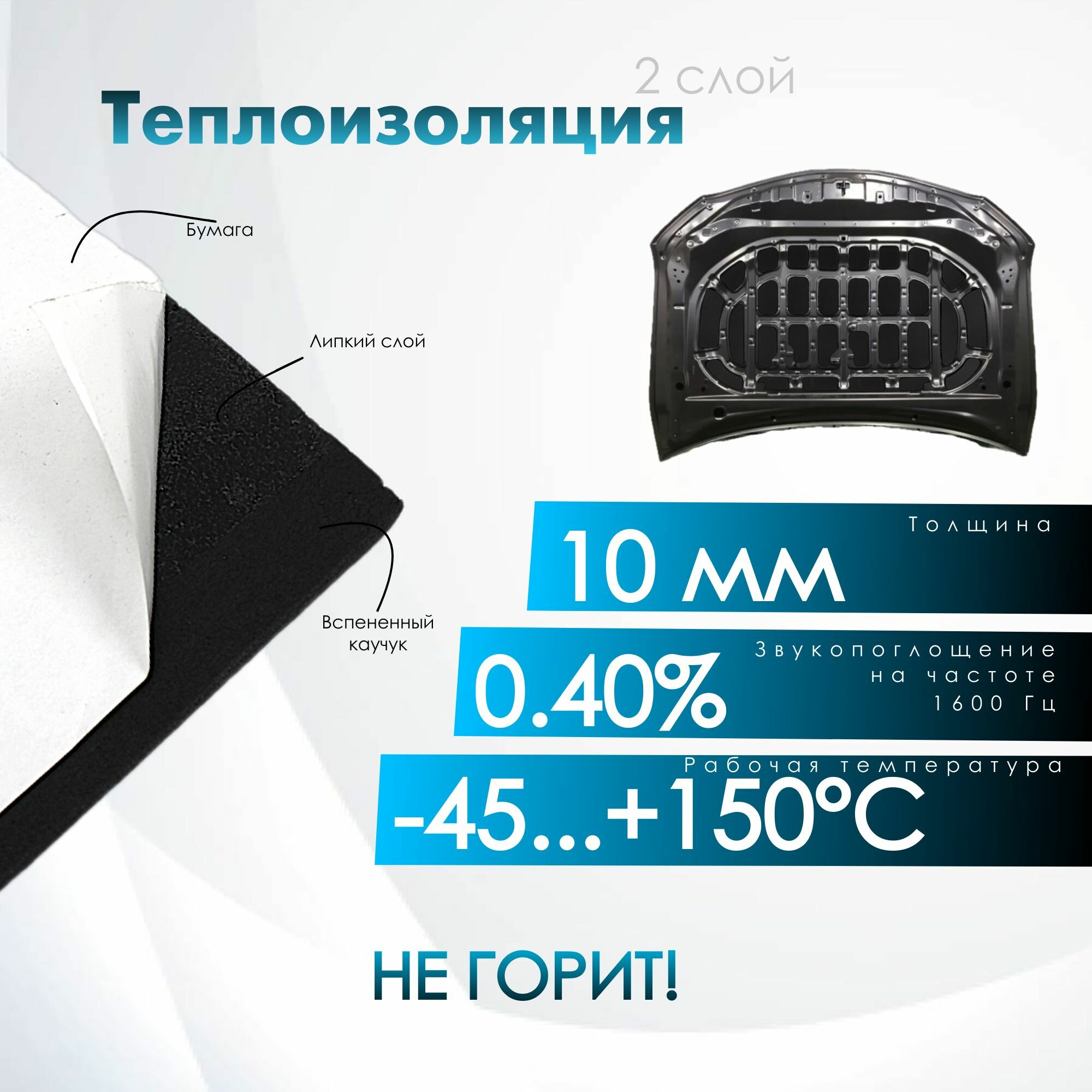 Комплект шумо и теплоизоляции капота Chery Tiggo 7 Pro Max T1E Лада X-cross 5 бутилкаучуковая основа с фольгой 2 мм вспененный каучук 10 мм 3 950 ₽
