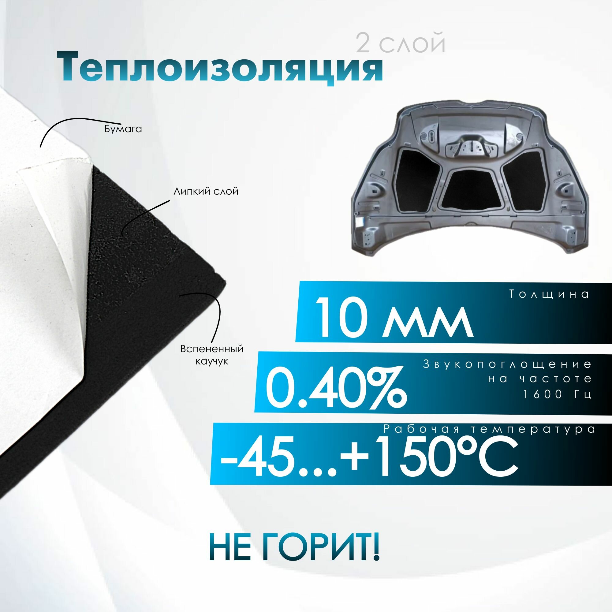 Комплект шумо и теплоизоляции капота Chery Tiggo 7 Pro Max T1E Лада X-cross 5 бутилкаучуковая основа с фольгой 2 мм вспененный каучук 10 мм 3 950 ₽