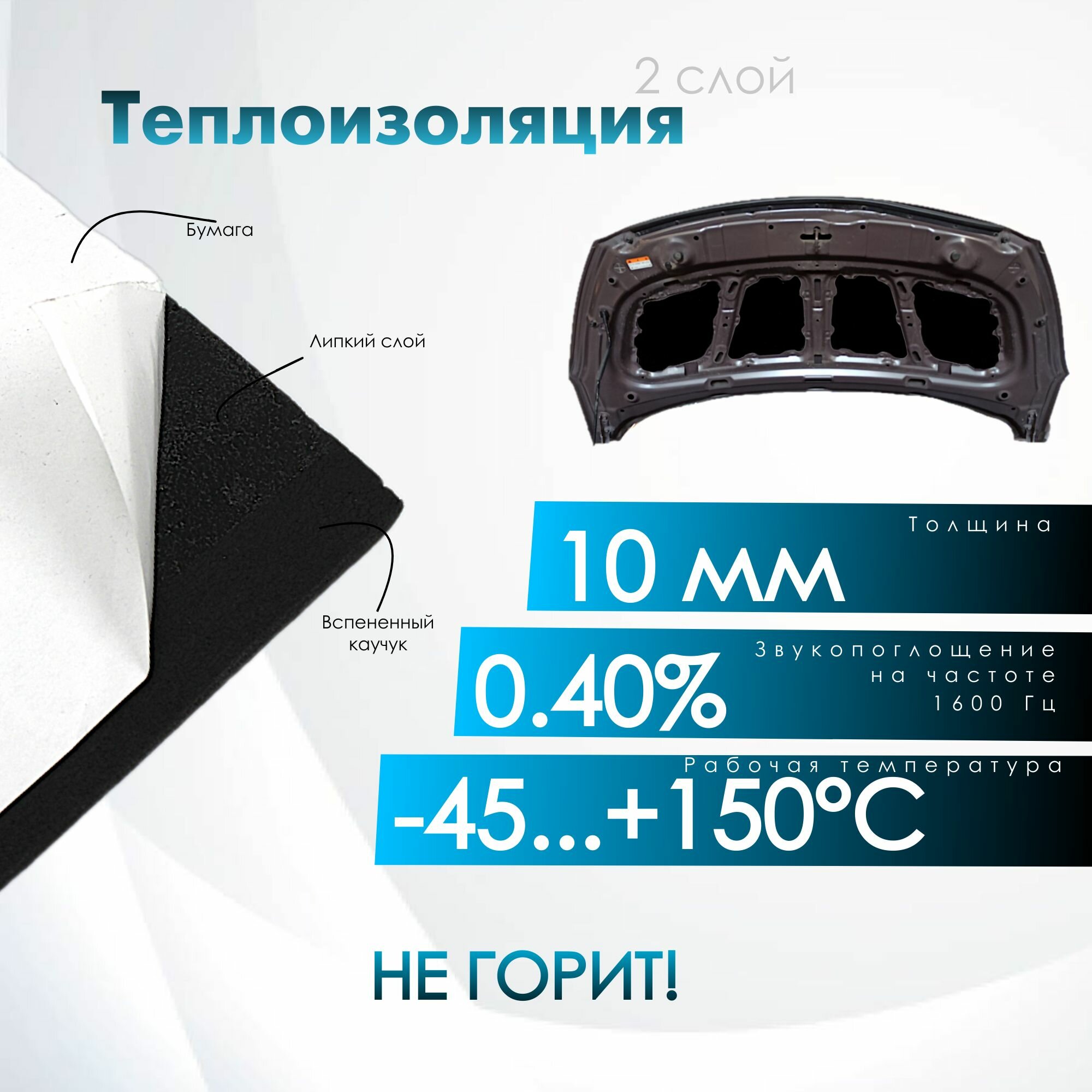 Комплект шумо и теплоизоляции капота Mitsubishi Lancer X бутилкаучуковая основа с фольгой 2 мм вспененный каучук 10 мм 3 650 ₽