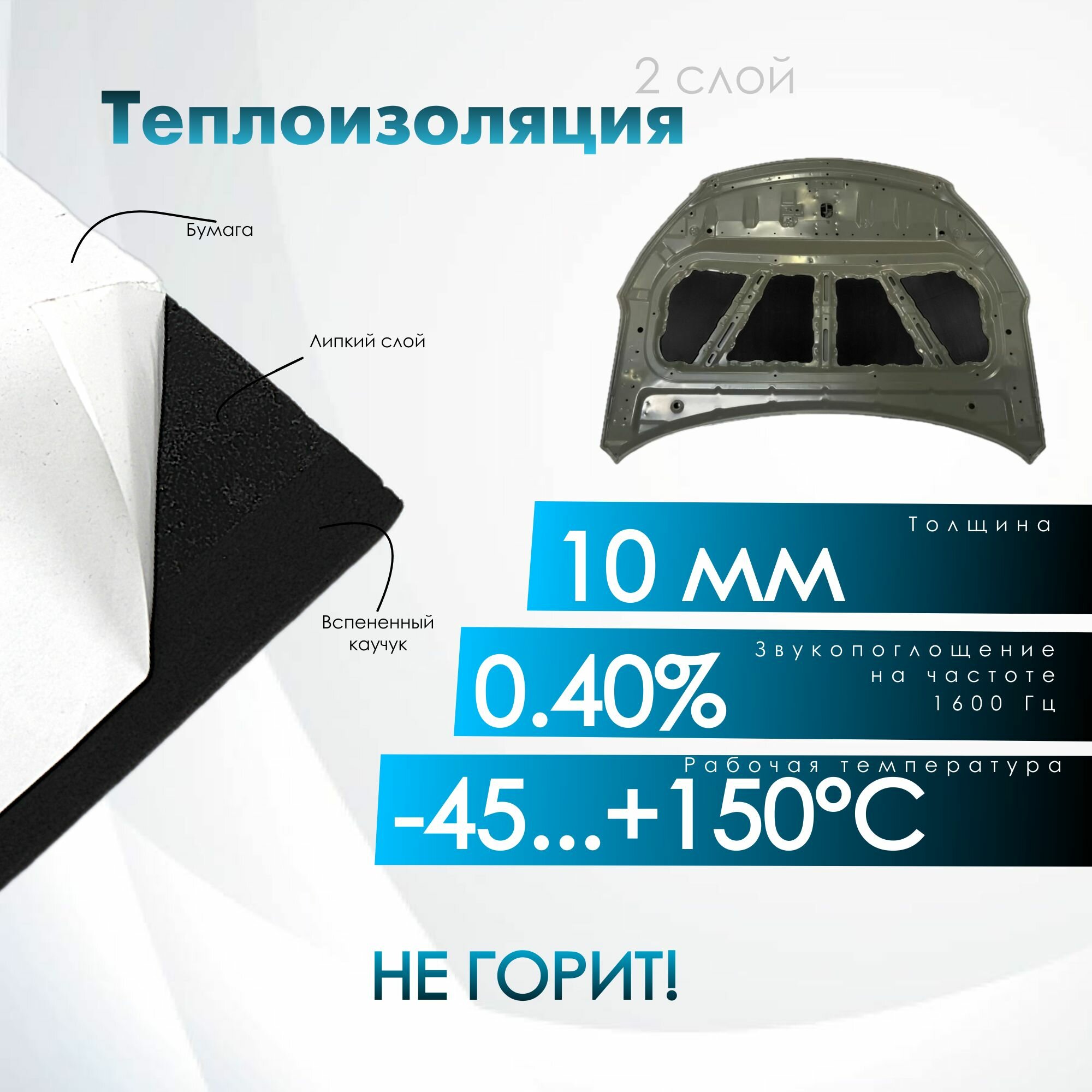 Комплект шумо и теплоизоляции капота Hyundai Tucson 1 бутилкаучуковая основа с фольгой 2 мм вспененный каучук 10 мм 3 650 ₽