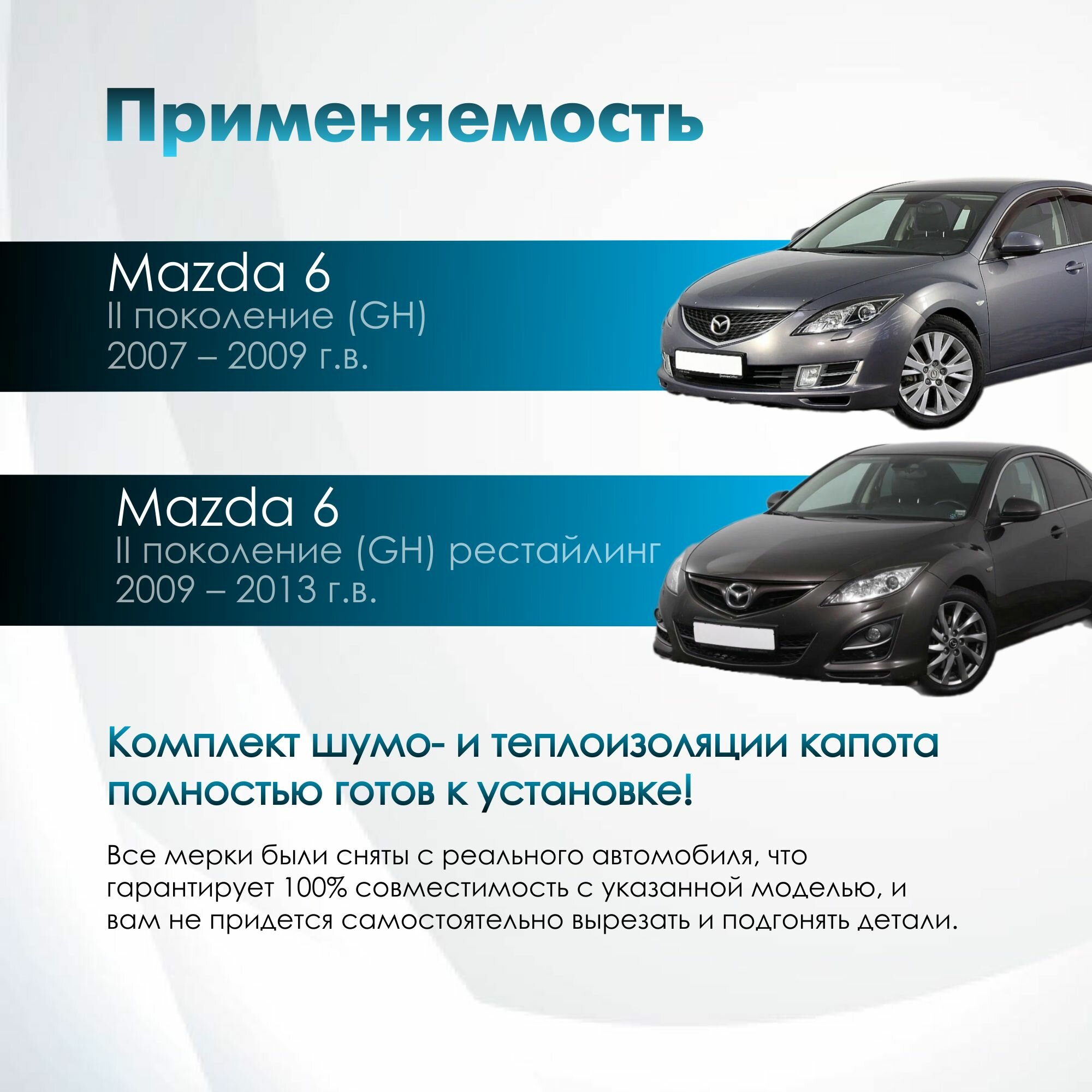 Отзывы на Комплект шумо и теплоизоляции капота Mazda 6 GH 2007-2013 бутилкаучуковая основа с фольгой 2 мм вспененный каучук 10 мм