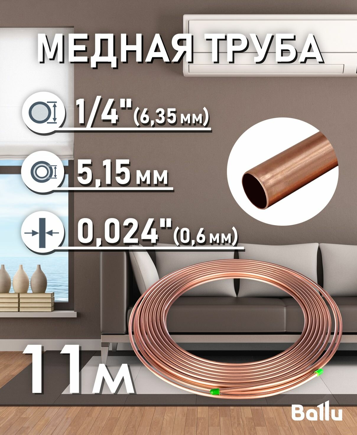 Труба медная 1/4" (6,35 мм) 11 метров Ballu Olympic информация: