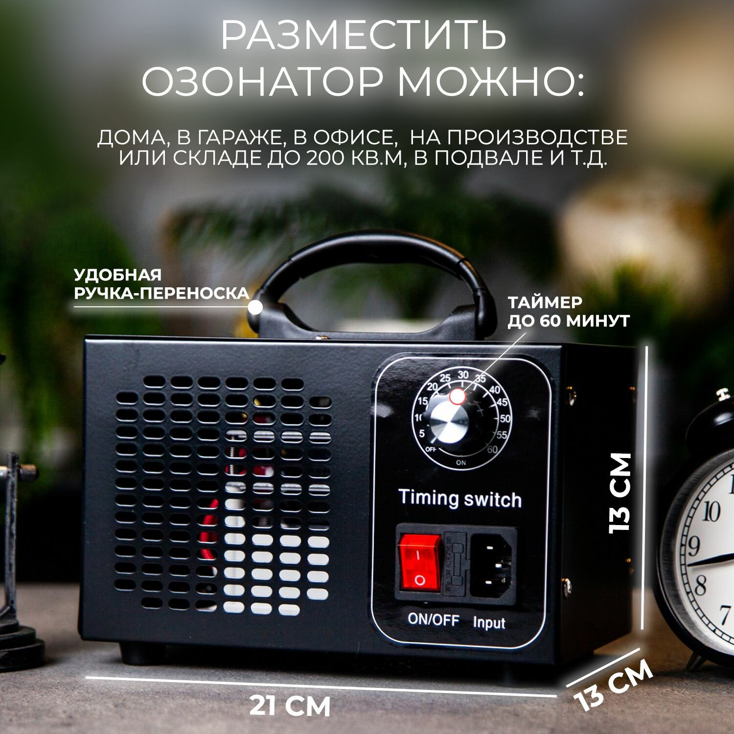 Озонатор 500 мг/час, 220AC/12DC с таймером. Очиститель и очиститель воздуха, воды, продуктов и холодильника, охват до 50 м2. Озонатор для дома.