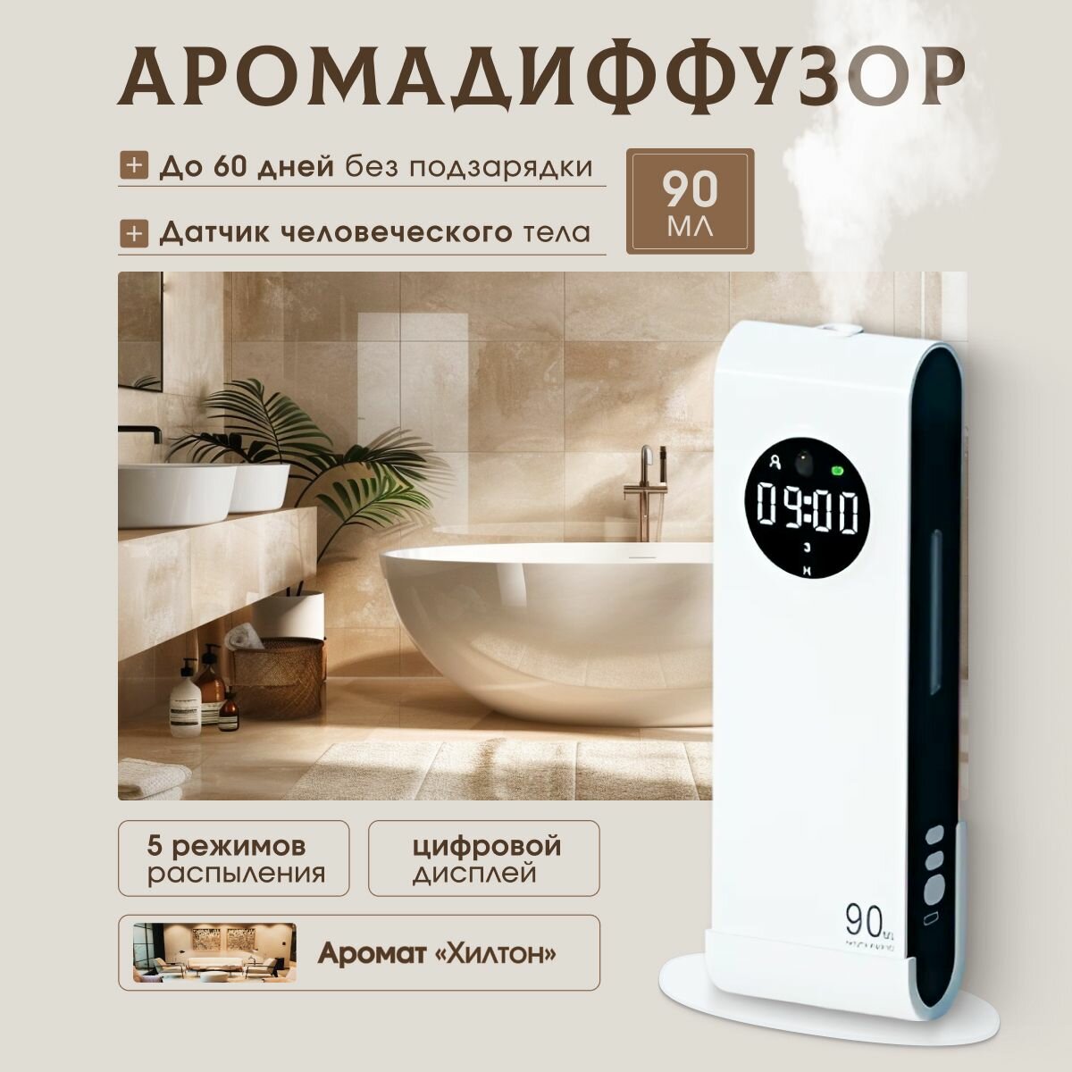 Аромадиффузор для дома ультразвуковой, белый, с подсветкой, аромат Хилтон информация: