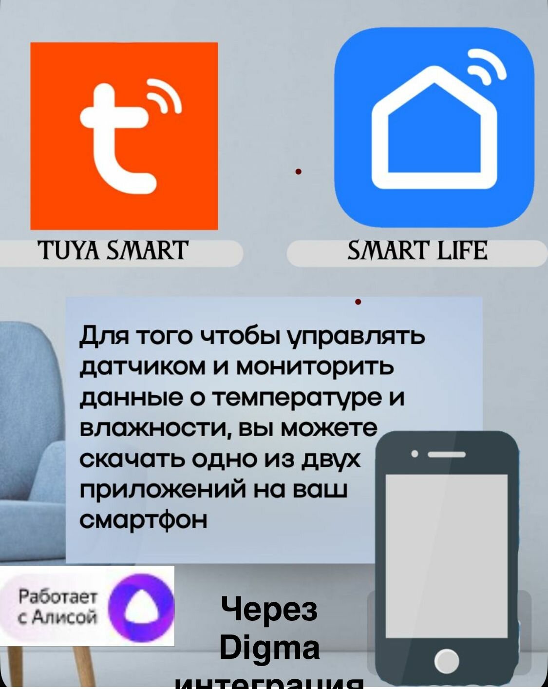 Умный гигрометр Датчик температуры, влажности и освещенности Tuya WIFI, дополнительный внешний датчик температуры, с Алисой через Digma информация:
