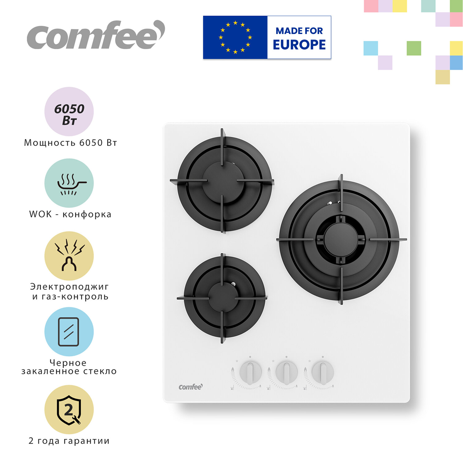 Отзывы на Газовая варочная панель Comfee CGH401GW, 45 см, 3 конфорки, WOK конфорка, электроподжиг, газ-контроль, закаленное стекло, белый