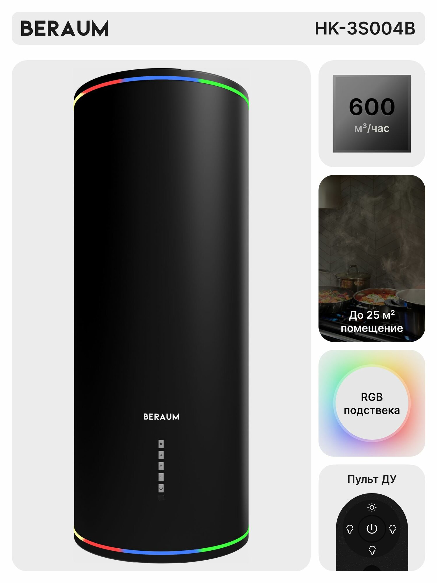 Вытяжка кухонная цилиндрическая Beraum HK-3S004B c RGB-подсветкой, инверторным двигателем и дистанционным управлением информация: