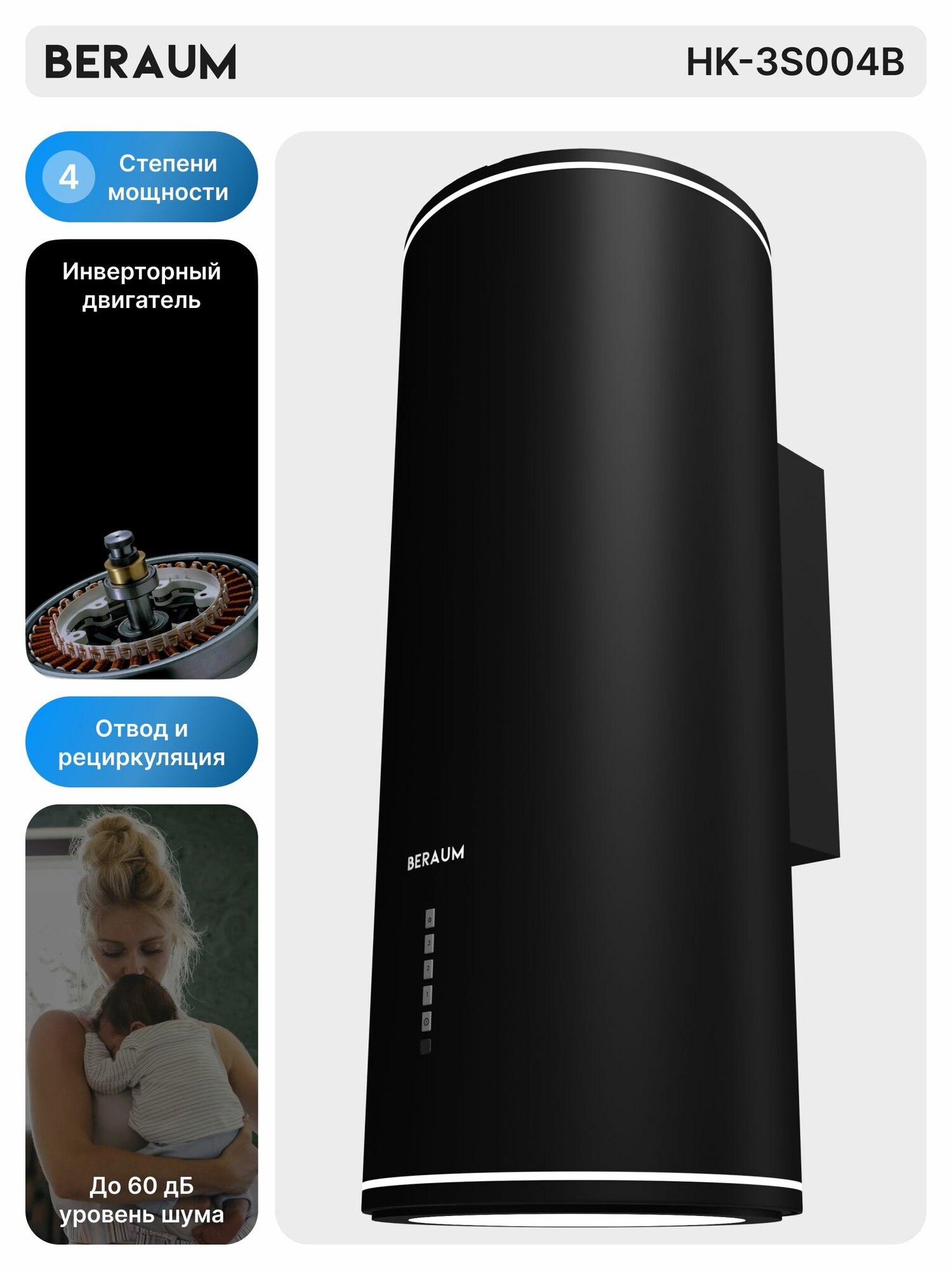 Отзывы на Вытяжка кухонная цилиндрическая Beraum HK-3S004B c RGB-подсветкой, инверторным двигателем и дистанционным управлением