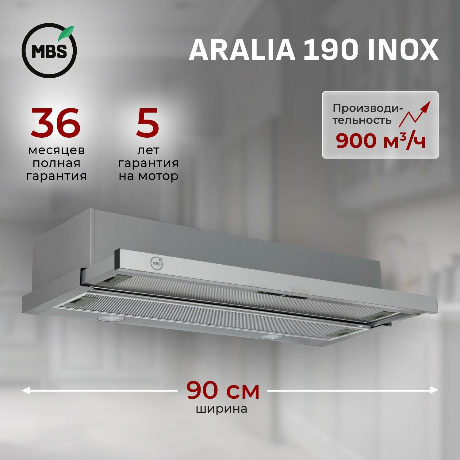 Кухонная вытяжка встраиваемая MBS ARALIA 190 INOX/90 см/производительность 900м3/ч, низкий уровень шума. информация:
