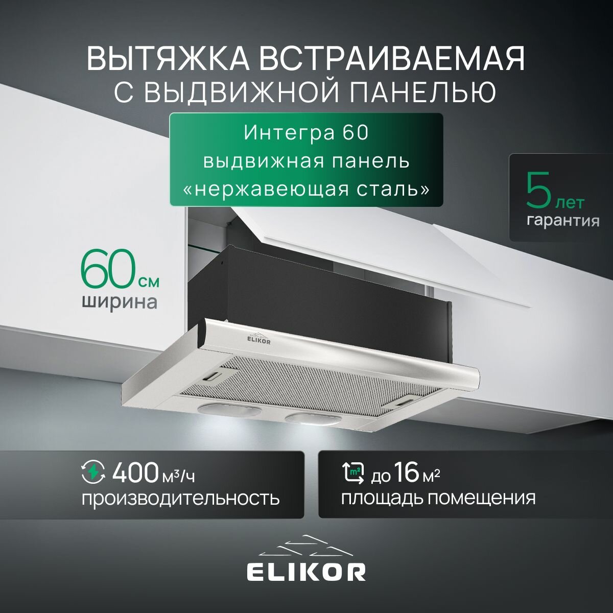 Отзывы на Вытяжка кухонная 60 см встраиваемая, 400 м3/ч, цвет нержавеющая сталь, ELIKOR Интегра 60П-400-В2Л, выдвижная, 2 скорости, управление клавишное, 2 лампы накаливания