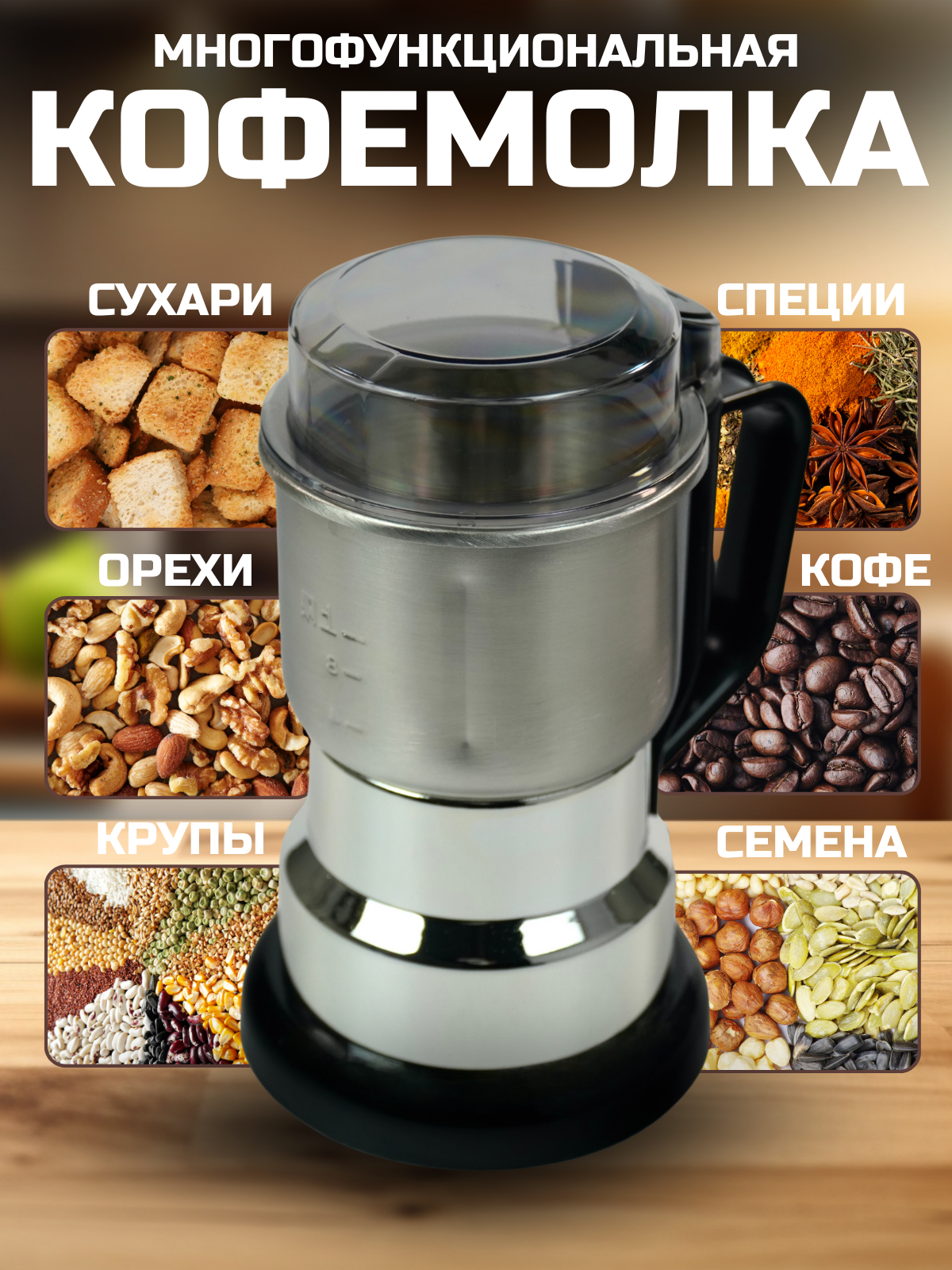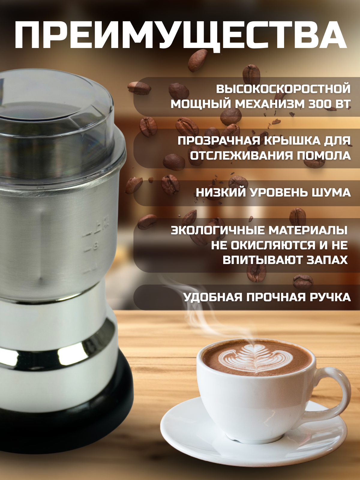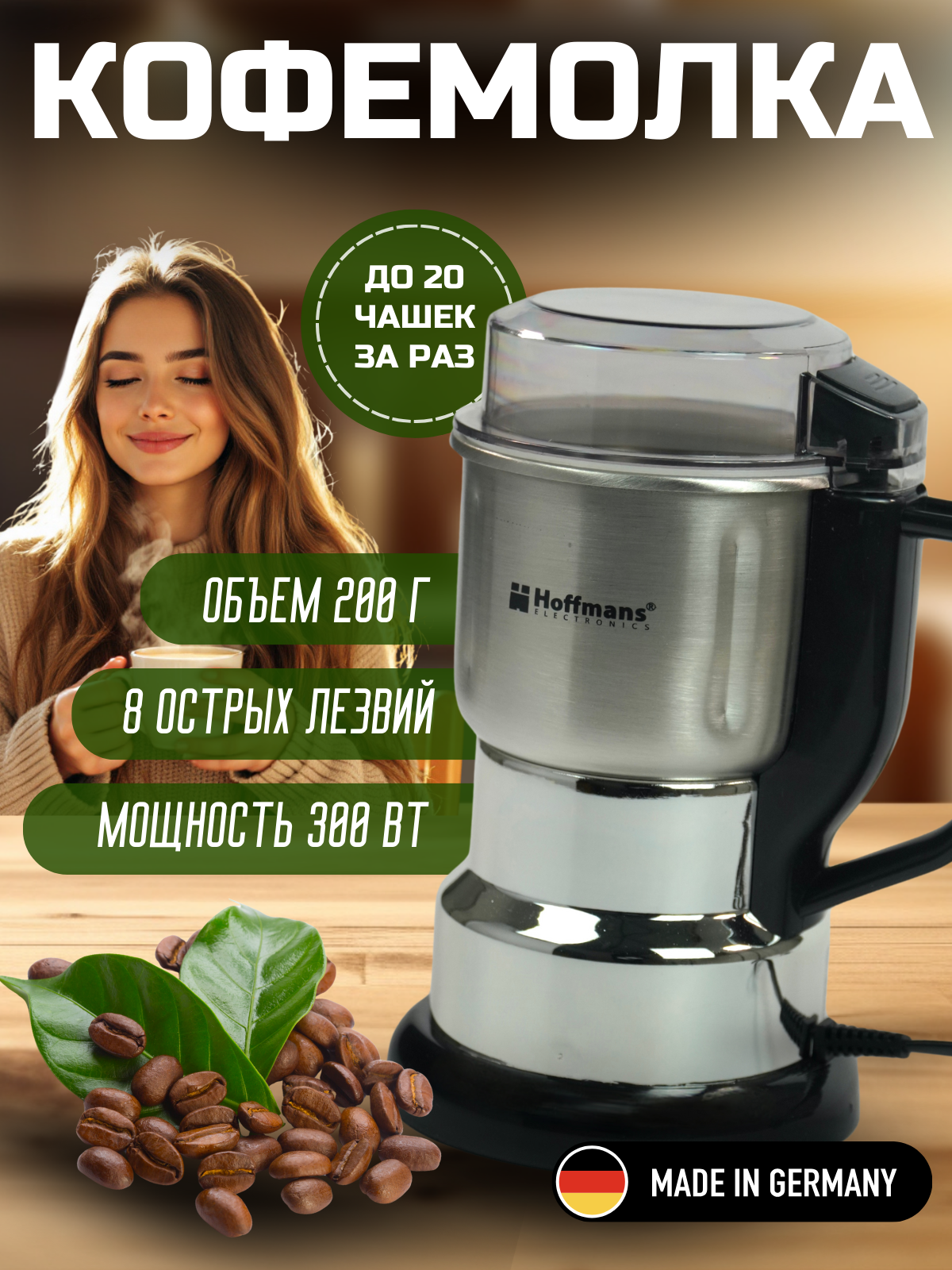 Кофемолка Hoffmans, электрическая, мощность 300 Вт, система помола ротационный нож, серебристая информация: