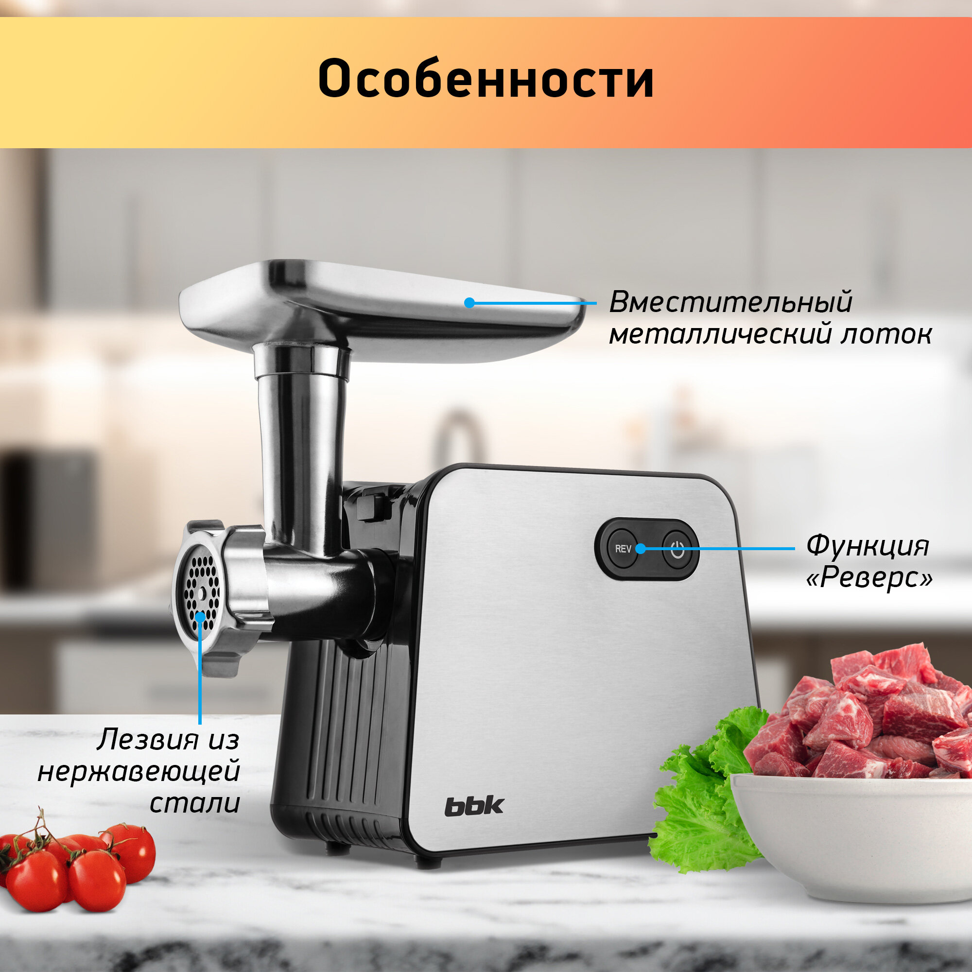 10 цен на Мясорубка электрическая BBK MG3001 металлик/черный, мощность 800 Вт, функция реверса, 4 насадки в комплекте
