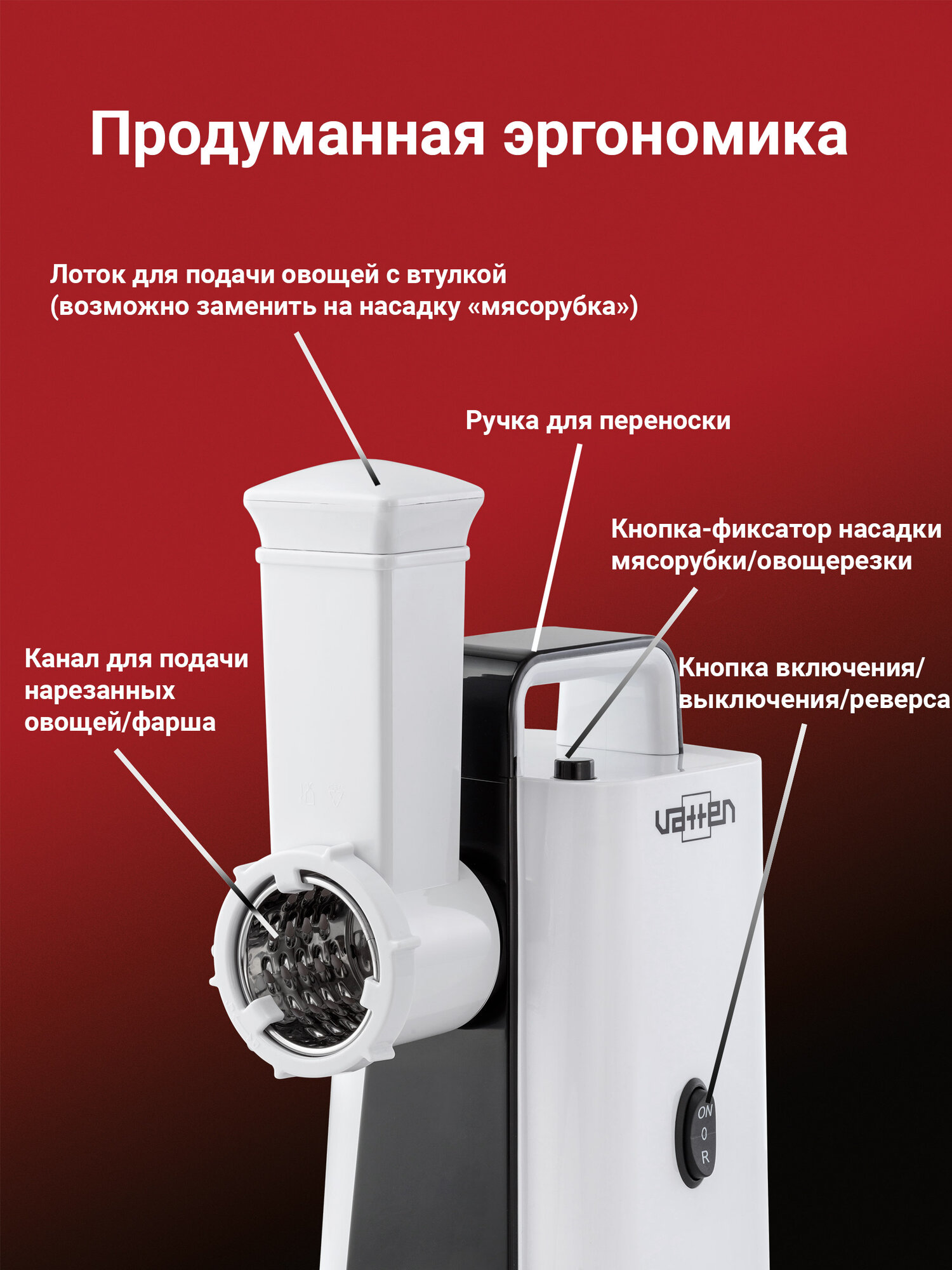 Мясорубка 2 в 1 VATTEN VG25/800/W, комплект овощерезки, белая информация: