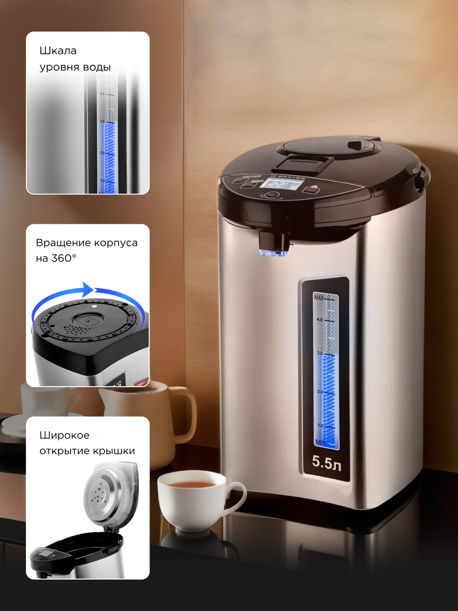 10 цен на Термопот BRAYER BR1097, 750Вт, 5,5л, 3 способа подачи воды, LCD-дисплей, поддержка и выбор температуры, черный/серебро