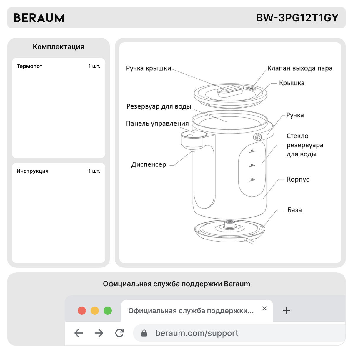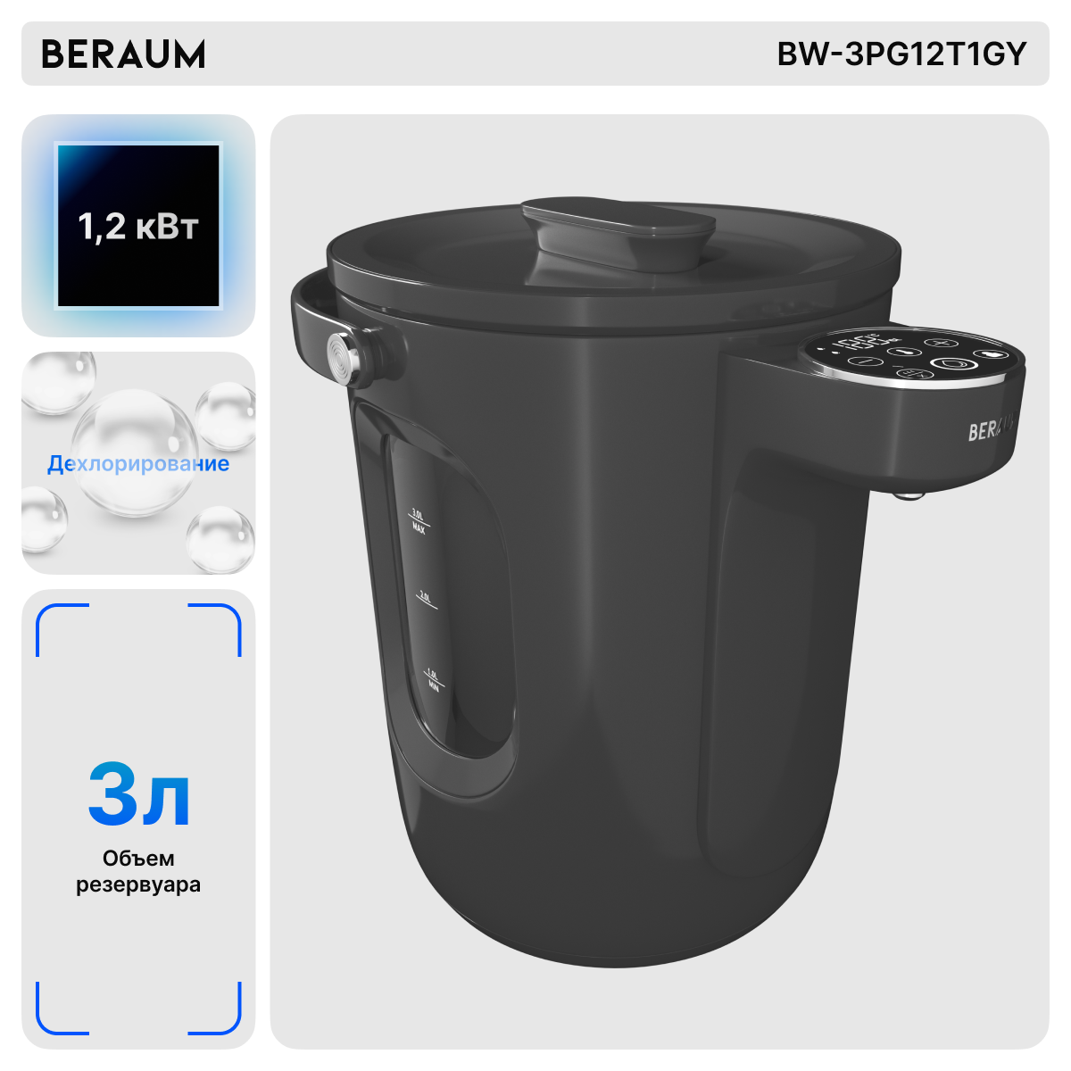 Термопот Beraum BW-3PG12T1GY с сенсорным управлением, поддержанием и регулировкой температуры информация: