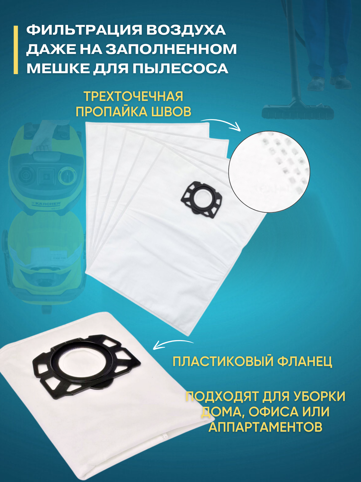 Фильтр-мешки флисовые для пылесоса Karcher WD 4/5/6, 5 шт. (2.863-006.0) информация: