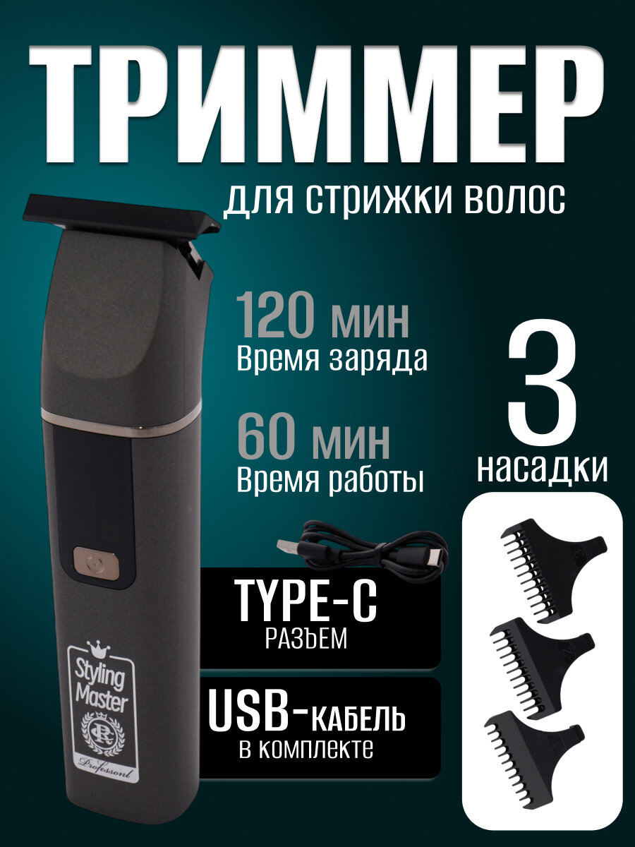 Профессиональный триммер для стрижки волос, для бороды и усов, для влажного и сухого бритья, 3 насадки , серый информация: