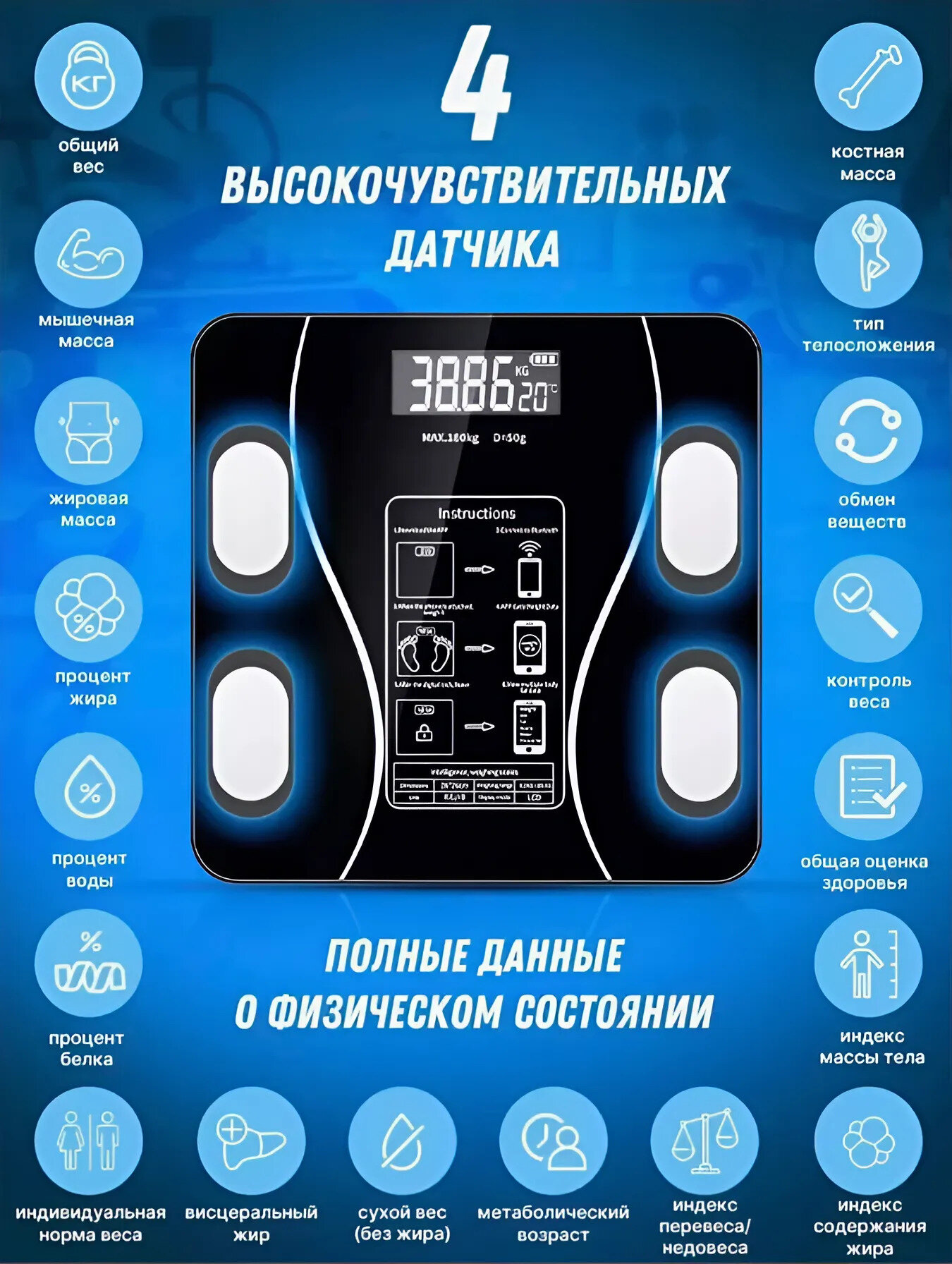 Умные весы напольные электронные с диагностикой параметров тела, 12 показателей, совместимы для IOS и Android, белый информация: