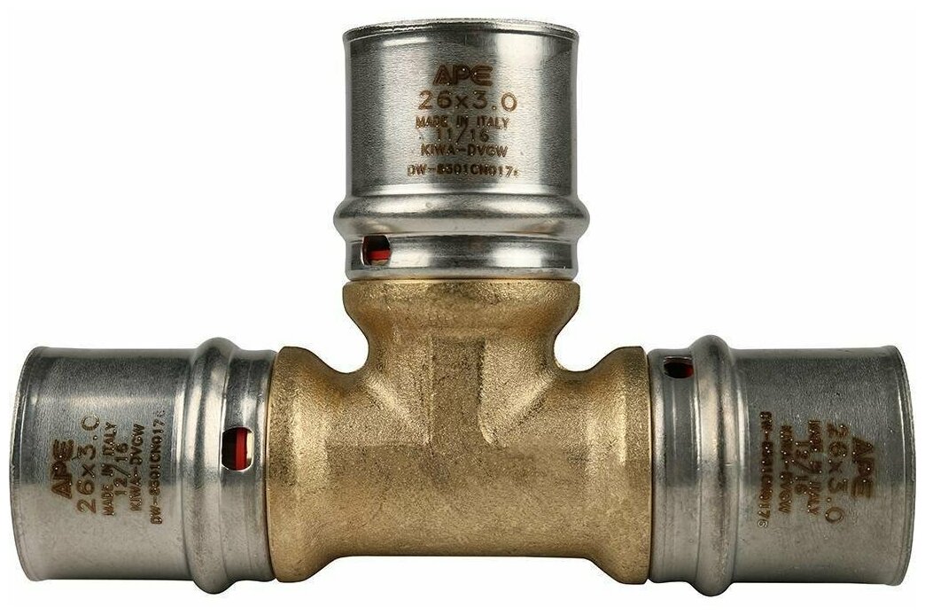 Тройник равнопроходный 26х26х26 для металлопластиковых труб прессовой ФУМ лента 10м