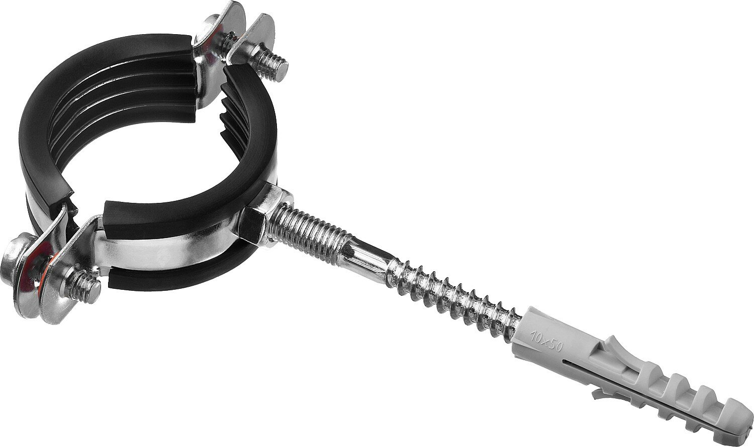 ЗУБР Хомут трубный с гайкой, оцинкованный, в комплекте с сантехнической шпилькой и дюбелем, 1 1/2", 1шт, информация: