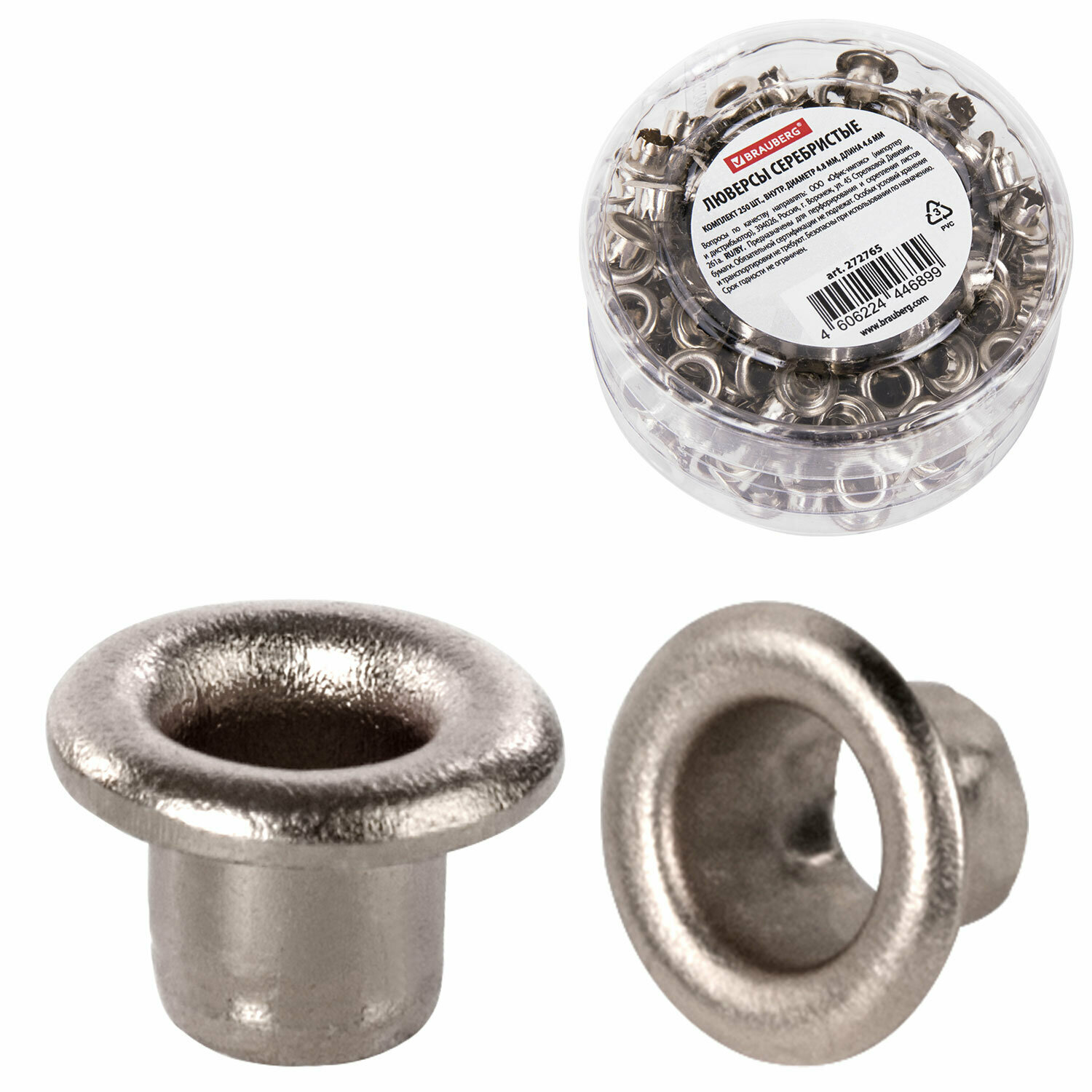 Люверсы серебристые комплект 250 шт, внутренний диаметр 4,8 мм, длина 4,6 мм, BRAUBERG, 272765 информация: